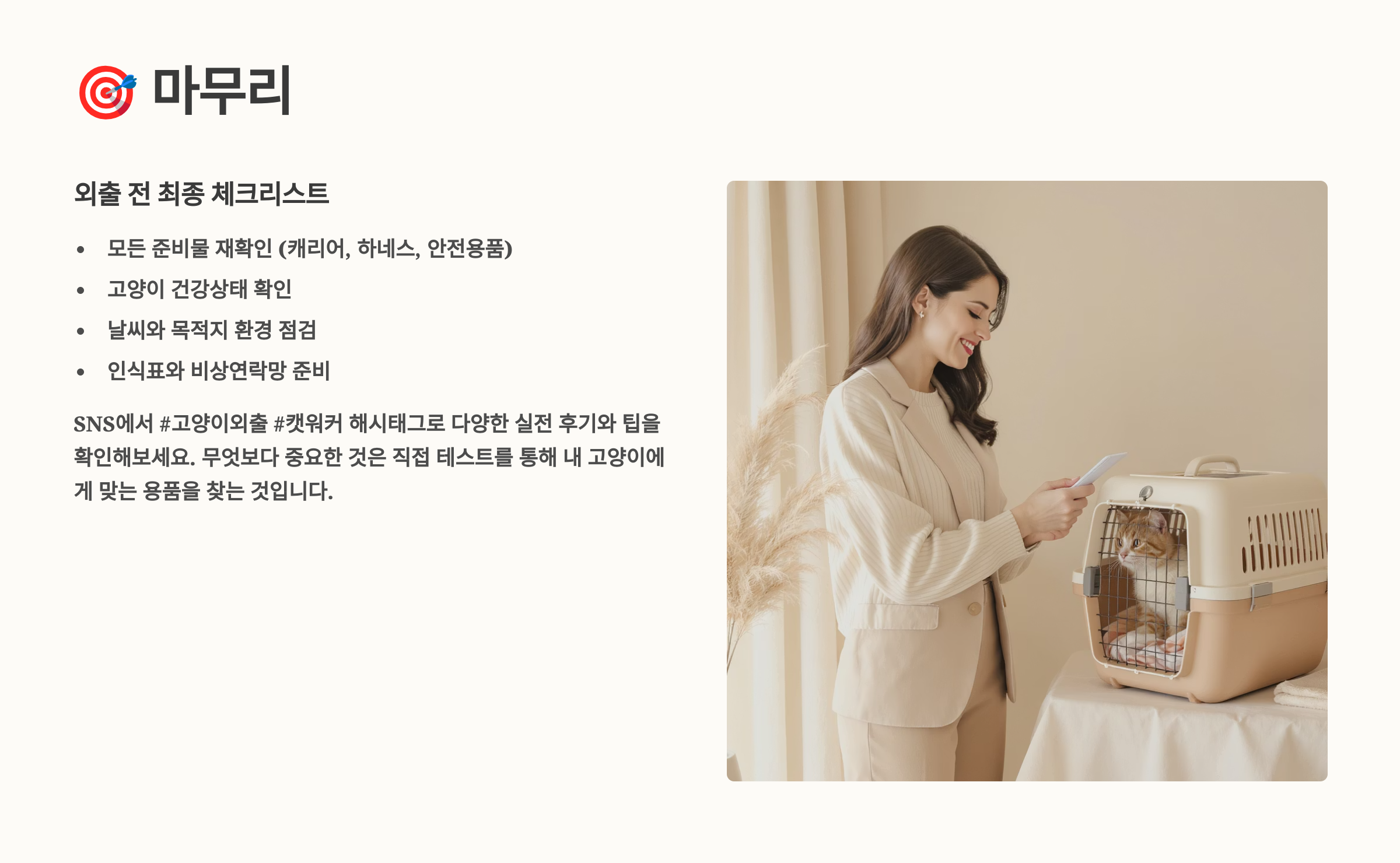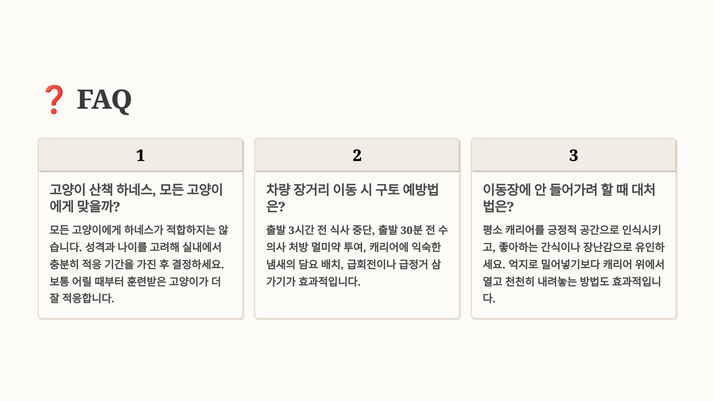 마지막으로 기억하세요. 고양이 외출은 서두르지 않고 천천히, 단계적으로 진행하는 것이 성공의 열쇠예요. 충분한 훈련과 적응 기간을 거치면 고양이도 외출을 즐거운 경험으로 받아들일 수 있어요. 여러분의 사랑하는 고양이와 함께 안전하고 행복한 외출 되시길 바라요! 🐱💕