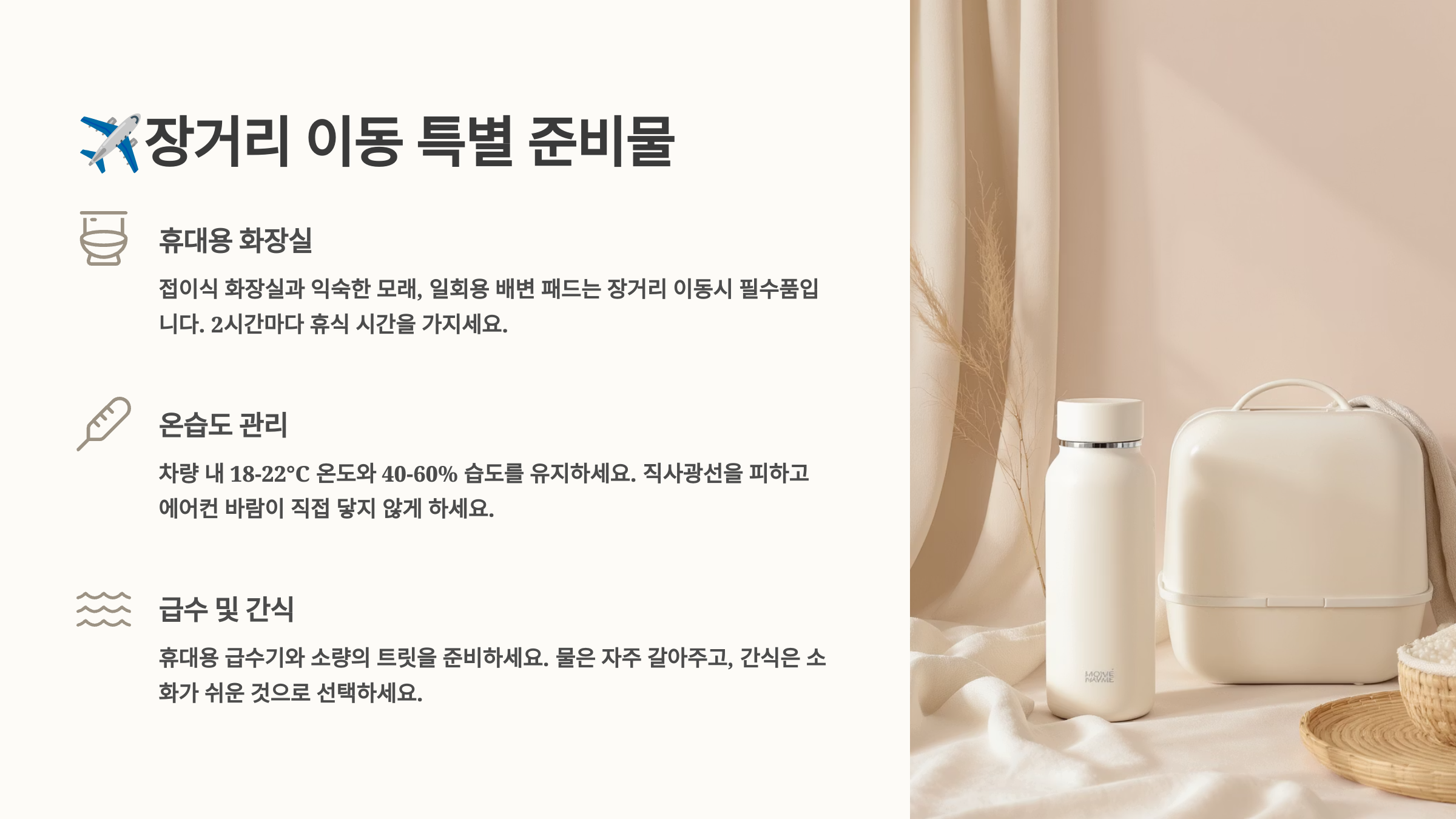 A29. 장시간 이동 시에는 소형 화장실을 넣을 수 있어요. 하지만 공간이 좁아지므로 큰 캐리어를 사용하거나 휴식 시간에 별도로 제공하는 것이 좋아요.