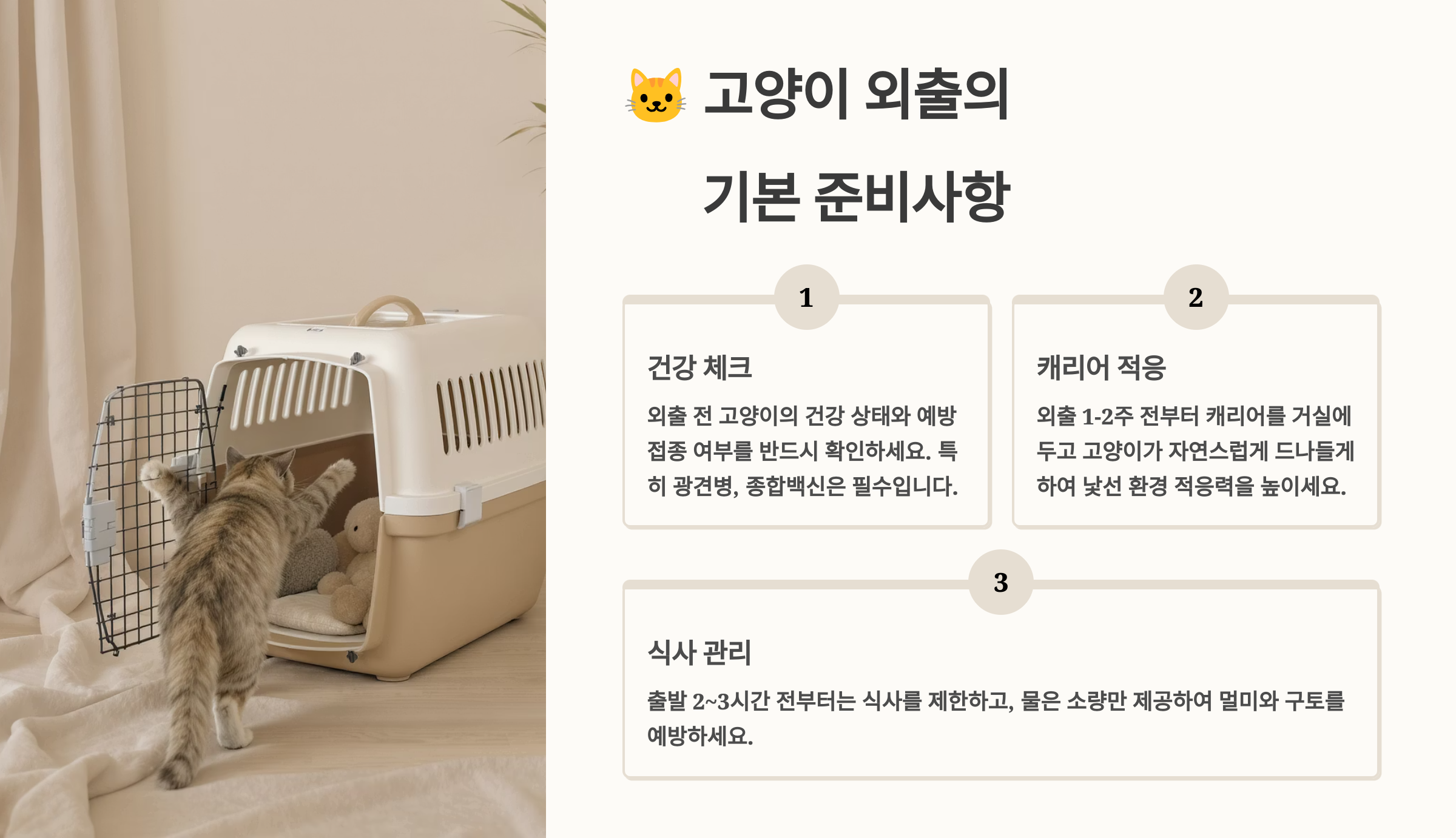 고양이와 함께하는 외출은 특별한 준비가 필요한 일이에요. 강아지와 달리 고양이는 영역 동물이라 낯선 환경에 스트레스를 많이 받거든요. 2025년 현재 반려묘 인구가 증가하면서 고양이 전용 외출용품도 다양해졌어요. 병원 방문부터 이사, 여행까지 상황에 맞는 적절한 용품을 준비하면 고양이도 보호자도 안전하고 편안한 외출이 가능하답니다.