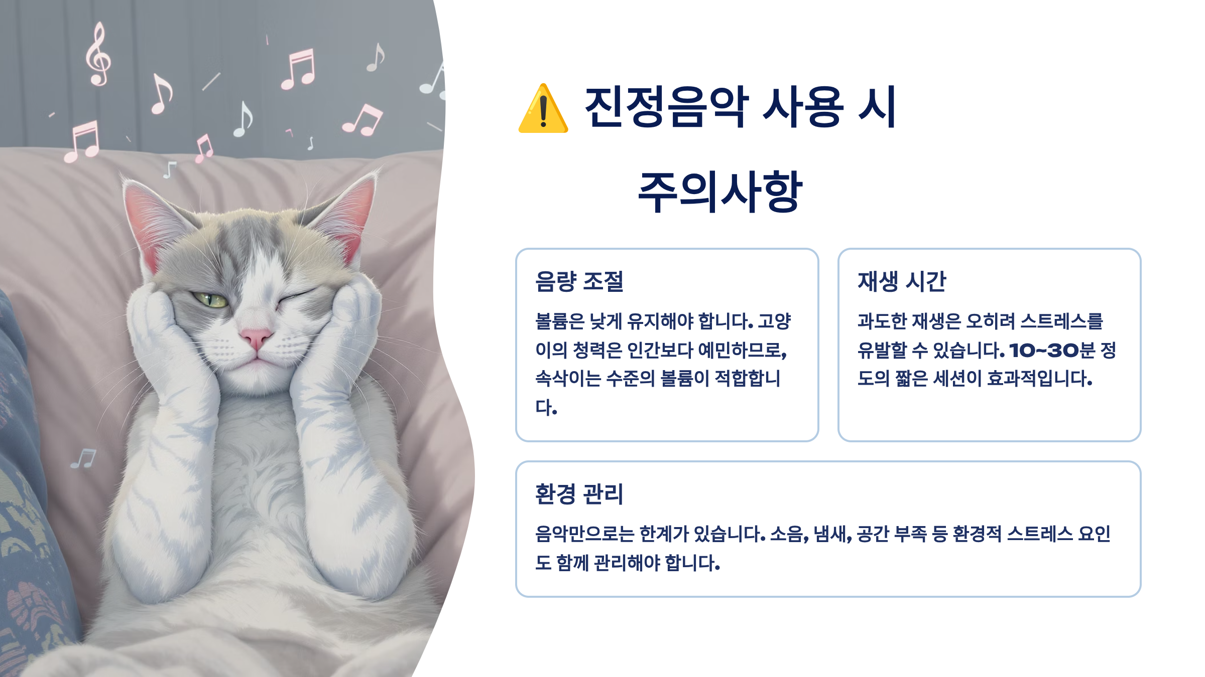 음악은 만능 해결책이 아니라 전체적인 케어의 일부라는 점을 기억하세요. 적절한 환경, 충분한 놀이, 균형 잡힌 영양, 그리고 무엇보다 보호자의 사랑과 관심이 함께할 때 진정한 효과를 발휘할 수 있어요. 음악을 통해 우리 고양이와 더 깊은 유대감을 형성하고, 함께 행복한 시간을 보내시길 바라요!