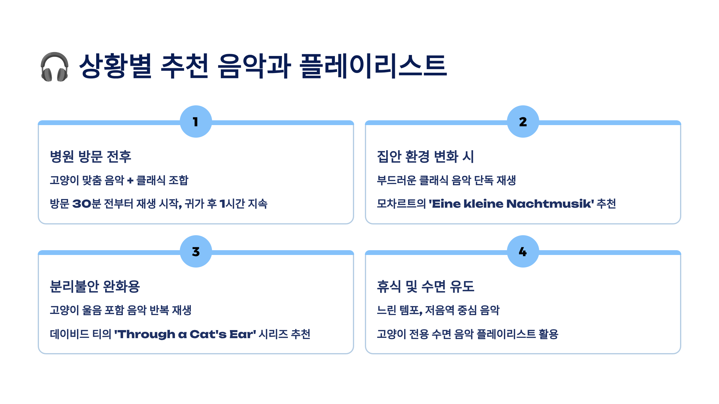 특수한 상황을 위한 플레이리스트도 있어요. 새끼 고양이를 위한 음악은 어미 고양이의 그르릉 소리와 심장박동 소리를 포함해야 해요. 노령 고양이를 위해서는 인지기능 향상에 도움이 되는 바로크 음악이 추천돼요. 수술 후 회복기에는 통증 완화 효과가 있는 432Hz 주파수 음악이 도움이 된답니다.