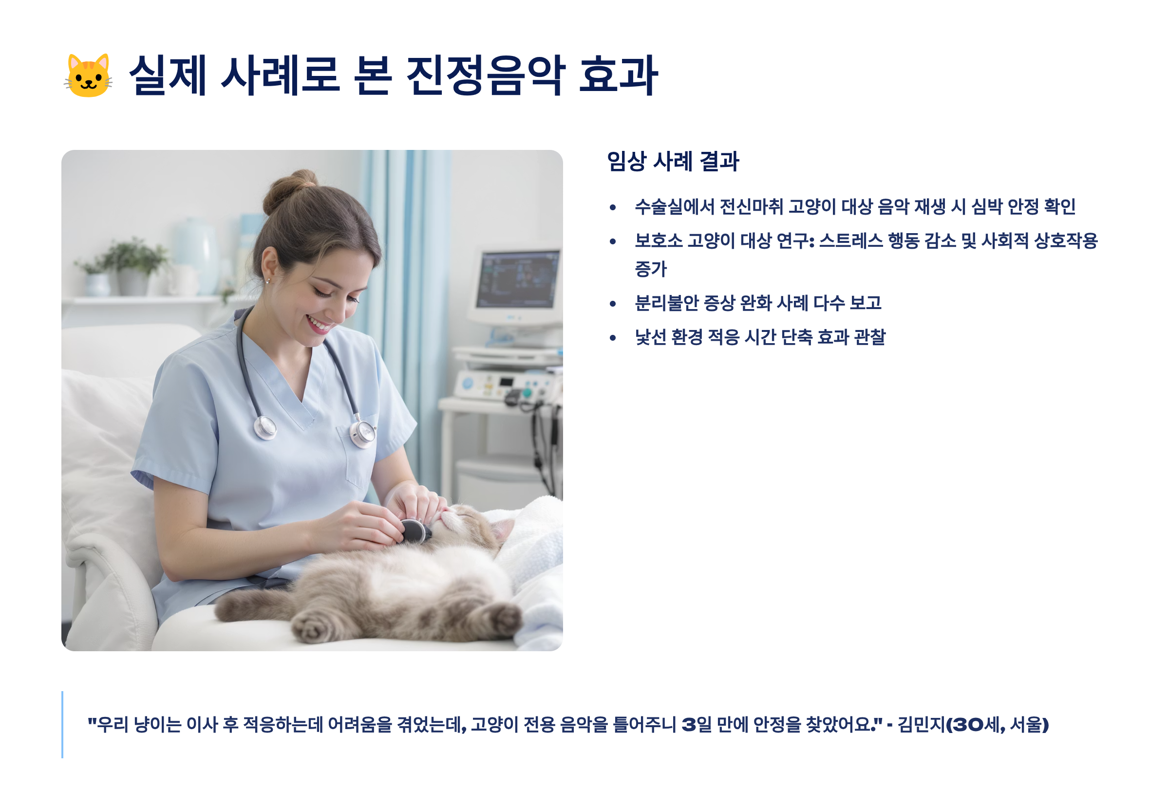 해외에서도 흥미로운 사례들이 보고되고 있어요. 미국의 한 대학 연구팀은 보호소 고양이 50마리를 대상으로 12주간 음악 치료를 실시했는데요. 음악을 들은 그룹의 고양이들이 대조군에 비해 입양 시 적응 기간이 평균 5일 단축되었다고 해요. 또한 새 가정에서의 문제 행동도 40% 감소했답니다.