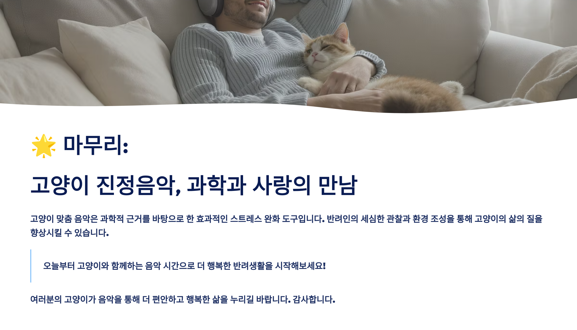 음악은 만능 해결책이 아니라 전체적인 케어의 일부라는 점을 기억하세요. 적절한 환경, 충분한 놀이, 균형 잡힌 영양, 그리고 무엇보다 보호자의 사랑과 관심이 함께할 때 진정한 효과를 발휘할 수 있어요. 음악을 통해 우리 고양이와 더 깊은 유대감을 형성하고, 함께 행복한 시간을 보내시길 바라요!