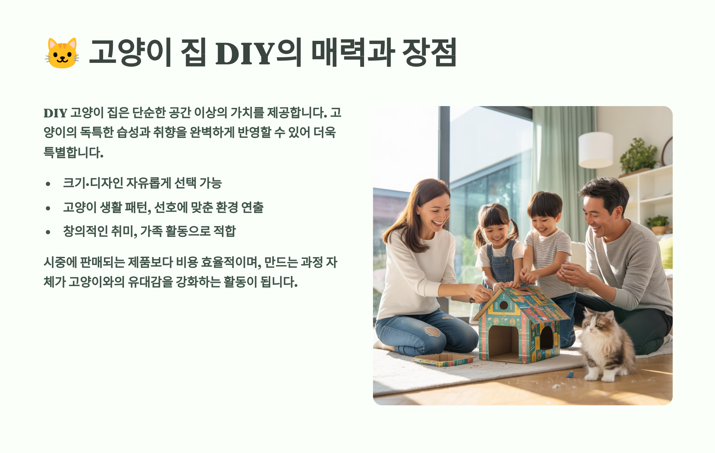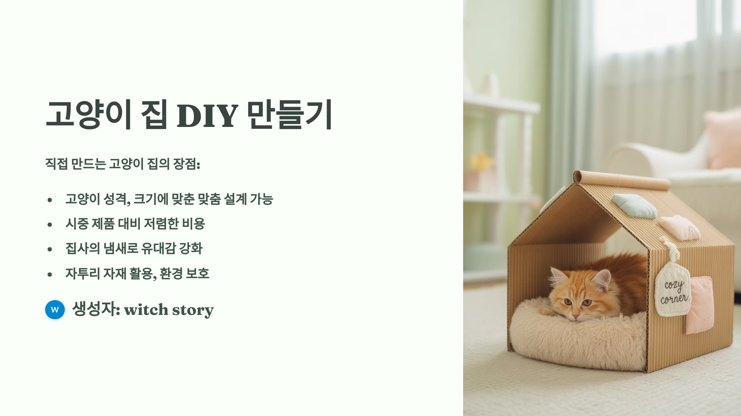 고양이 집을 직접 만들면 우리 집 인테리어와 어울리는 디자인으로 제작할 수 있고, 고양이의 성격과 취향에 맞춰 커스터마이징도 가능해요. 무엇보다 만드는 과정 자체가 즐겁고, 완성했을 때의 뿌듯함은 이루 말할 수 없답니다. 함께 시작해볼까요? 😊