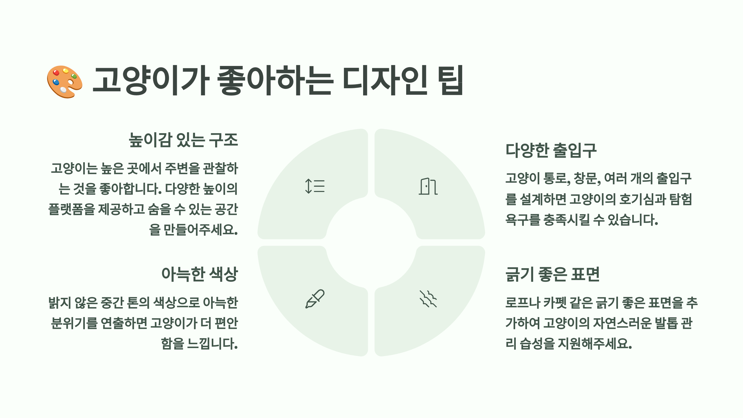 또한 우리 고양이의 성격과 습성을 가장 잘 아는 사람은 바로 집사님이잖아요? 🐾 어떤 고양이는 높은 곳을 좋아하고, 어떤 고양이는 아늑한 동굴 같은 공간을 선호해요. DIY로 만들면 이런 개별적인 취향을 100% 반영할 수 있답니다. 크기도 우리 집 공간에 딱 맞게 조절할 수 있고, 색상이나 디자인도 인테리어와 조화롭게 만들 수 있어요.