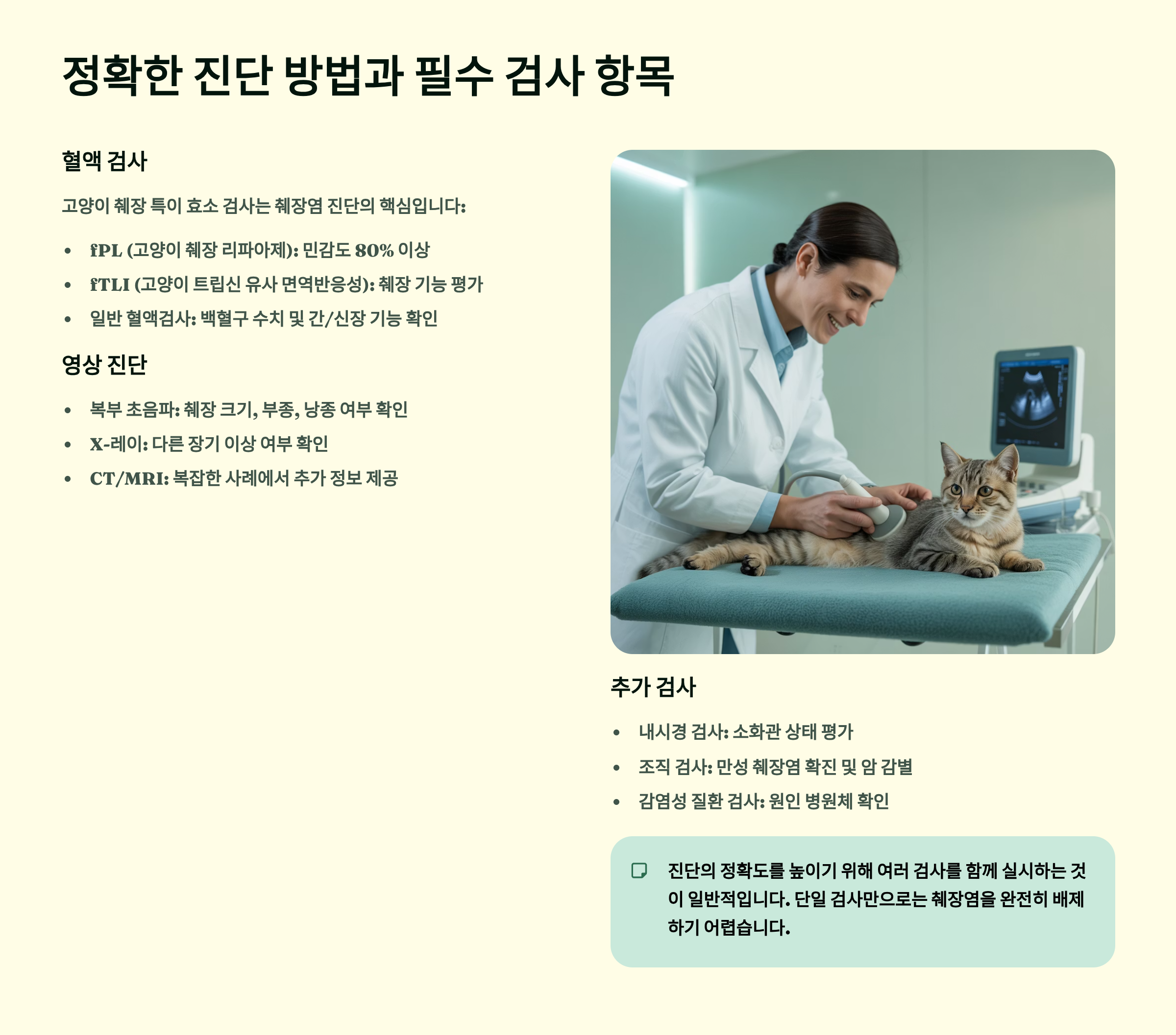 고양이 췌장염의 정확한 진단은 쉽지 않아요. 증상이 비특이적이고 다른 질병과 유사하기 때문에 여러 검사를 종합적으로 판단해야 해요. 가장 먼저 시행하는 것은 신체검사예요. 수의사는 복부 촉진으로 통증 반응을 확인하고, 탈수 정도를 평가하며, 체온과 심박수를 측정해요. 복부 촉진 시 고양이가 긴장하거나 공격적으로 변한다면 복통이 있다는 신호예요.
