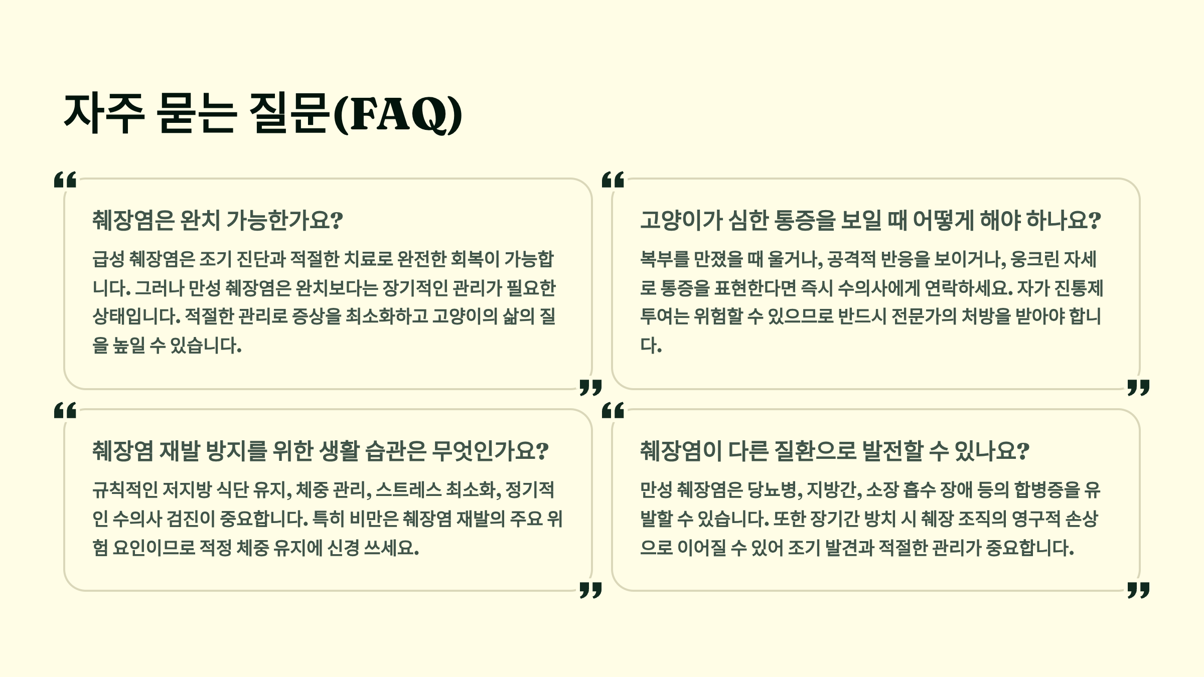 본 콘텐츠는 고양이 췌장염에 대한 일반적인 정보 제공을 목적으로 작성되었습니다. 개별 고양이의 건강 상태와 증상은 다를 수 있으며, 본 정보는 수의사의 전문적인 진단과 치료를 대체할 수 없습니다. 췌장염이 의심되는 증상이 나타나면 즉시 동물병원을 방문하여 정확한 진단과 치료를 받으시기 바랍니다. 자가 진단이나 치료는 위험할 수 있으며, 모든 의학적 결정은 담당 수의사와 상의 후 이루어져야 합니다.