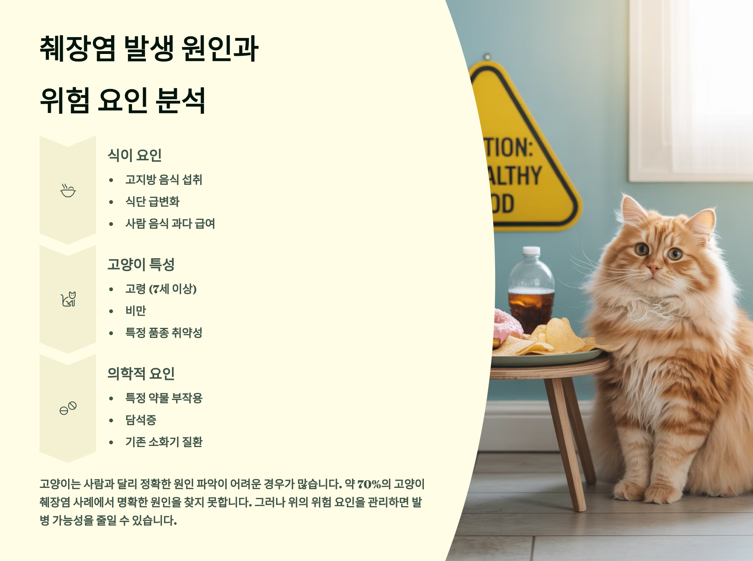 고양이 췌장염의 정확한 원인은 대부분 특발성(원인불명)이에요. 약 90% 이상의 경우에서 명확한 원인을 찾을 수 없어요. 하지만 여러 위험 요인들이 복합적으로 작용하여 췌장염을 유발한다고 알려져 있어요. 가장 중요한 위험 요인은 비만이에요. 과체중 고양이는 정상 체중 고양이보다 췌장염 발생률이 2.5배 높아요. 지방 조직에서 분비되는 염증 물질들이 췌장에 악영향을 미치기 때문이죠.