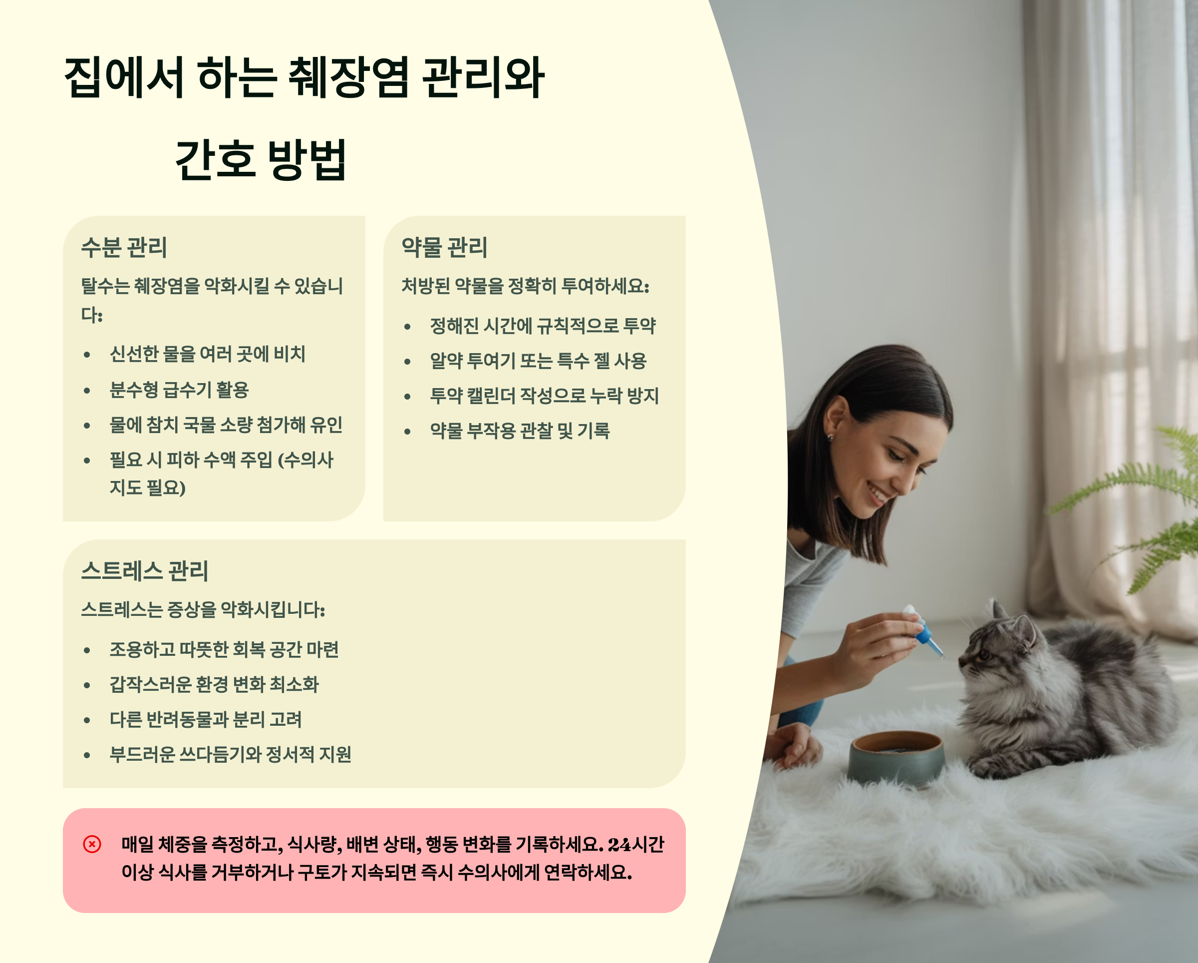 행동 변화를 주의 깊게 관찰해요. 통증이 있으면 구부정한 자세, 복부 긴장, 그루밍 감소, 숨기 등의 행동을 보여요. 호흡이 빨라지거나, 침을 많이 흘리거나, 입술을 핥는 것도 불편함의 신호예요. 이런 증상이 악화되면 즉시 병원에 연락하세요. 매일 같은 시간에 체중을 측정하여 기록하는 것도 중요해요.