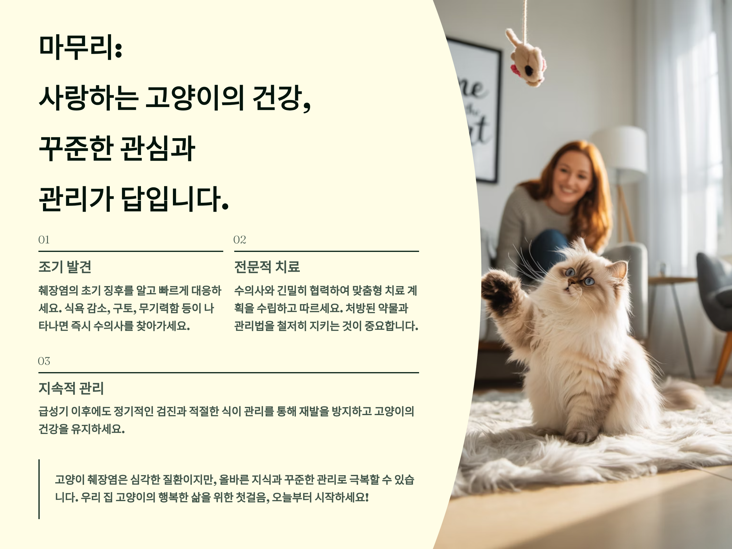 췌장염은 분명 심각한 질병이지만, 절망할 필요는 없어요. 현대 수의학의 발전으로 진단과 치료 방법이 크게 개선되었고, 많은 고양이들이 췌장염을 극복하고 건강한 삶을 살고 있어요. 믿을 수 있는 수의사와 함께 최선의 치료 계획을 세우고, 꾸준히 관리한다면 우리 소중한 고양이와 오랫동안 행복한 시간을 보낼 수 있을 거예요! 🐱💕