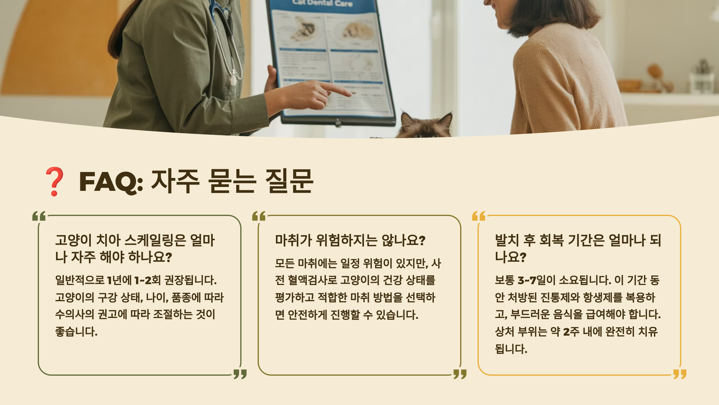 스케일링 주기는 고양이마다 달라요. 양치를 꾸준히 하고 있다면 2-3년에 한 번이면 충분하지만, 관리가 어려운 경우 1년에 한 번씩 필요할 수도 있어요. 치석이 빨리 쌓이는 체질의 고양이도 있고, 먹는 사료의 종류에 따라서도 달라져요. 수의사와 상담해서 우리 아이에게 맞는 주기를 정하는 것이 중요해요.