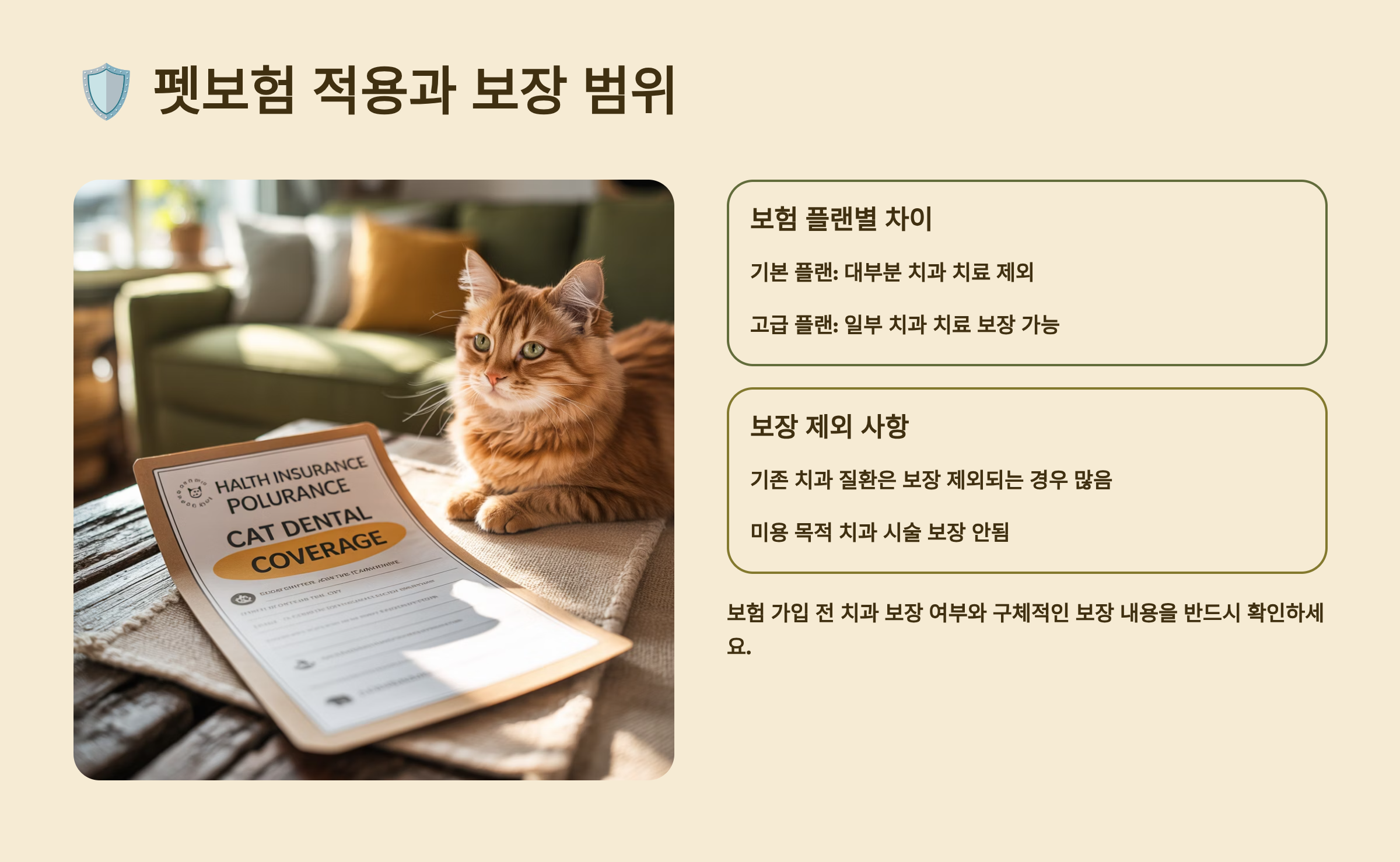 펫보험의 치과 보장은 크게 두 가지로 나뉘어요. 질병성 치과 치료와 사고성 치과 치료예요. 질병성은 치주질환, 치아흡수병변, 구내염 등이 해당되고, 사고성은 외상으로 인한 치아 파절 등이에요. 대부분의 보험은 질병성 치과 치료를 보장하지만, 가입 후 일정 기간의 면책기간이 있어요. 보통 30일에서 90일 정도랍니다.