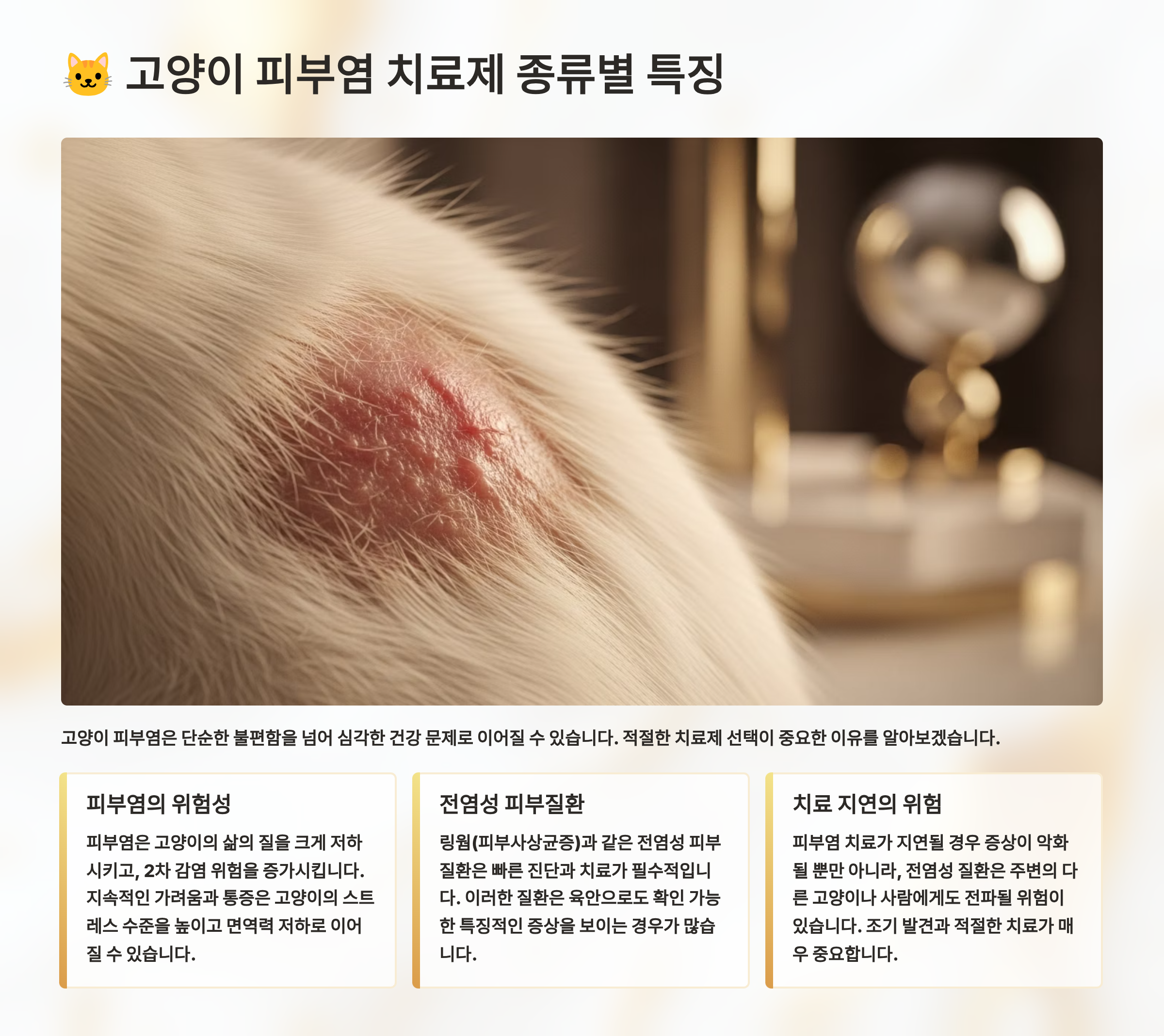 본 콘텐츠는 일반적인 정보 제공을 목적으로 작성되었으며, 전문적인 수의학적 조언을 대체할 수 없습니다. 고양이의 건강 상태는 개체별로 다르므로, 피부염 증상이 나타나면 반드시 수의사의 진료를 받으시기 바랍니다. 본 정보를 바탕으로 한 자가 진단이나 치료는 권장하지 않으며, 약물 사용 전 반드시 전문가와 상담하세요.