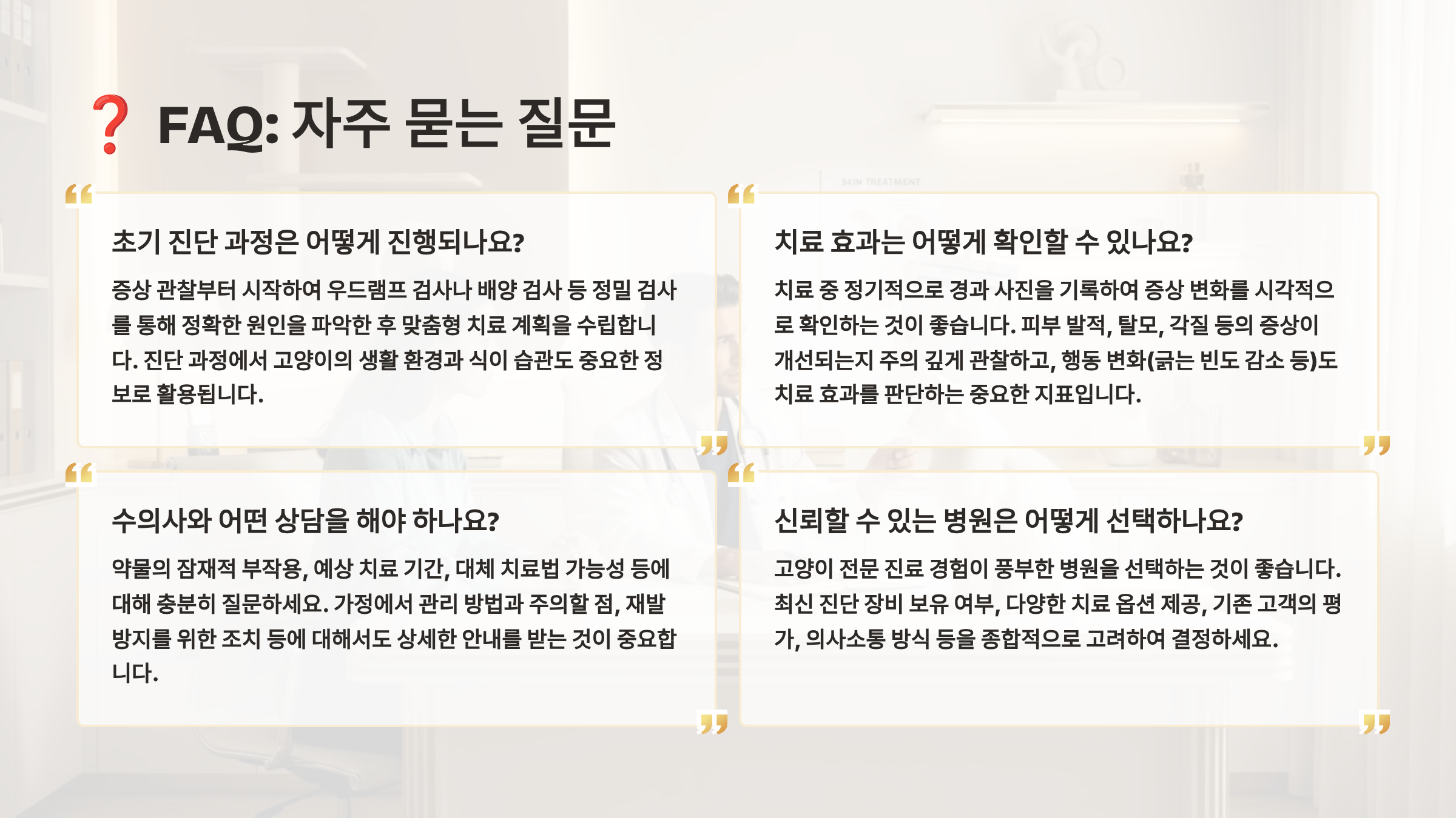 A30. 피부과 전문 수의사나 경험이 많은 병원을 선택하세요. 체계적인 진단 과정과 단계별 치료 계획을 제시하는 곳이 좋아요. 2차 소견을 구하는 것도 도움이 되고, 신뢰할 수 있는 주치의를 만드는 게 중요합니다.