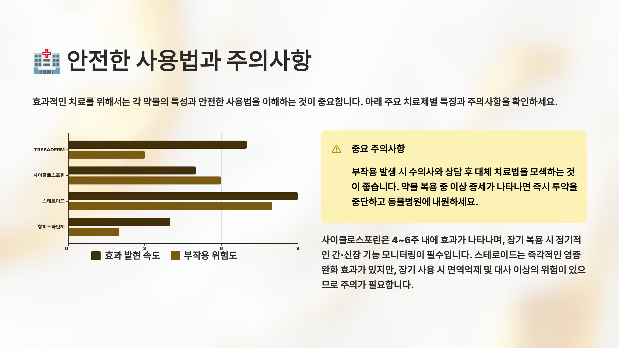 부작용 모니터링도 빼놓을 수 없어요. 구토, 설사, 식욕부진이 나타나면 즉시 수의사와 상담해야 해요. 스테로이드 장기 사용 시에는 다음다뇨 증상이 나타날 수 있는데, 이런 경우 용량 조절이 필요해요. 🚨