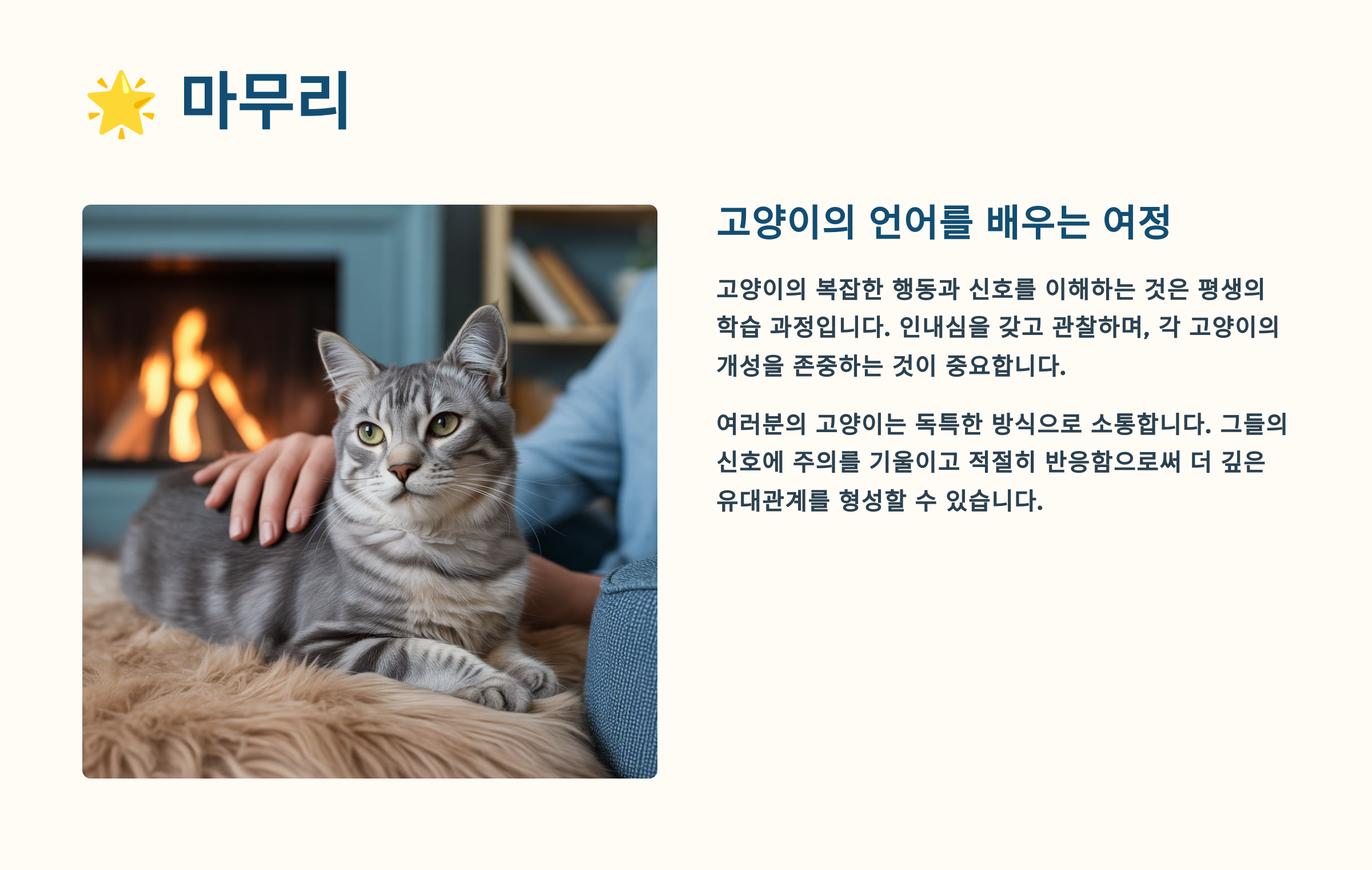 모든 고양이는 각자의 개성과 성격을 가지고 있어요. 일반적인 행동 패턴을 알아두는 것도 중요하지만, 무엇보다 내 고양이만의 특별한 신호를 파악하는 게 중요해요. 매일 관찰하고 교감하다 보면 자연스럽게 서로를 이해하게 될 거예요.