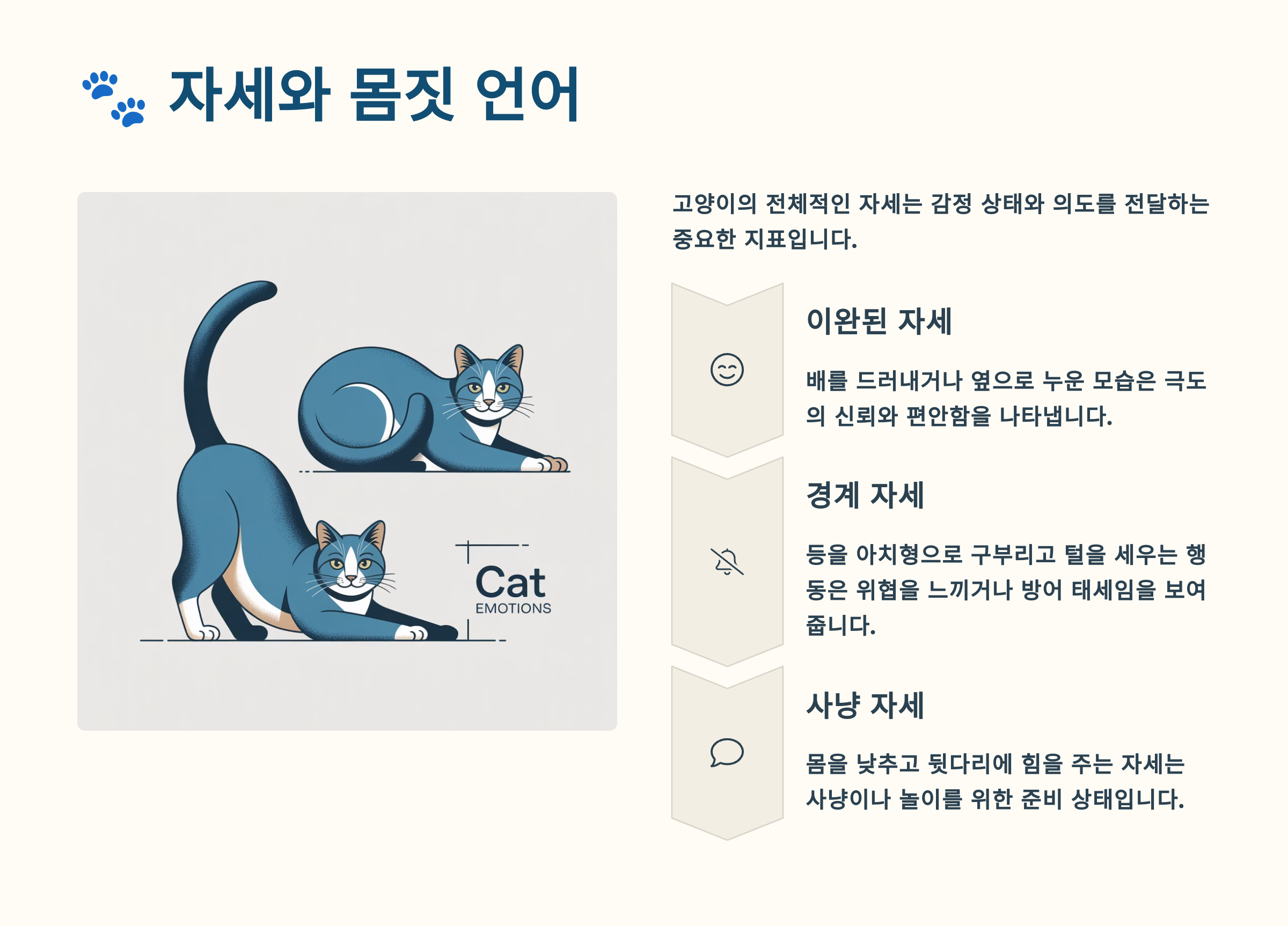 고양이의 몸 전체 자세는 그들의 감정 상태를 가장 명확하게 보여주는 지표예요. 등을 구부리는 정도, 다리의 위치, 몸의 긴장도 등을 종합적으로 관찰하면 고양이가 지금 어떤 기분인지 정확히 알 수 있어요. 고양이는 유연한 몸을 가지고 있어서 다양한 자세로 자신의 감정을 표현한답니다.