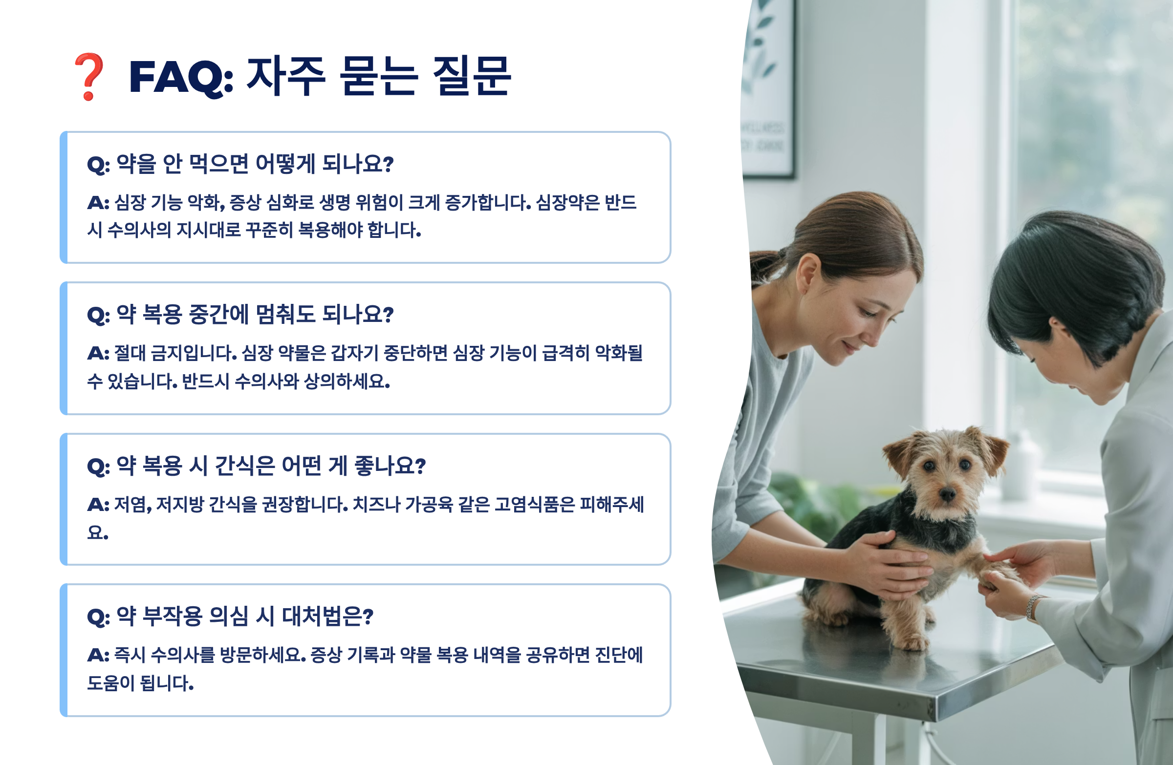 A2. 대부분의 경우 평생 복용해야 해요. 심장병은 진행성 질환이라 약을 중단하면 악화될 수 있어요. 하지만 정기 검진을 통해 용량 조절은 가능하고, 상태가 안정되면 일부 약물은 감량할 수도 있답니다.