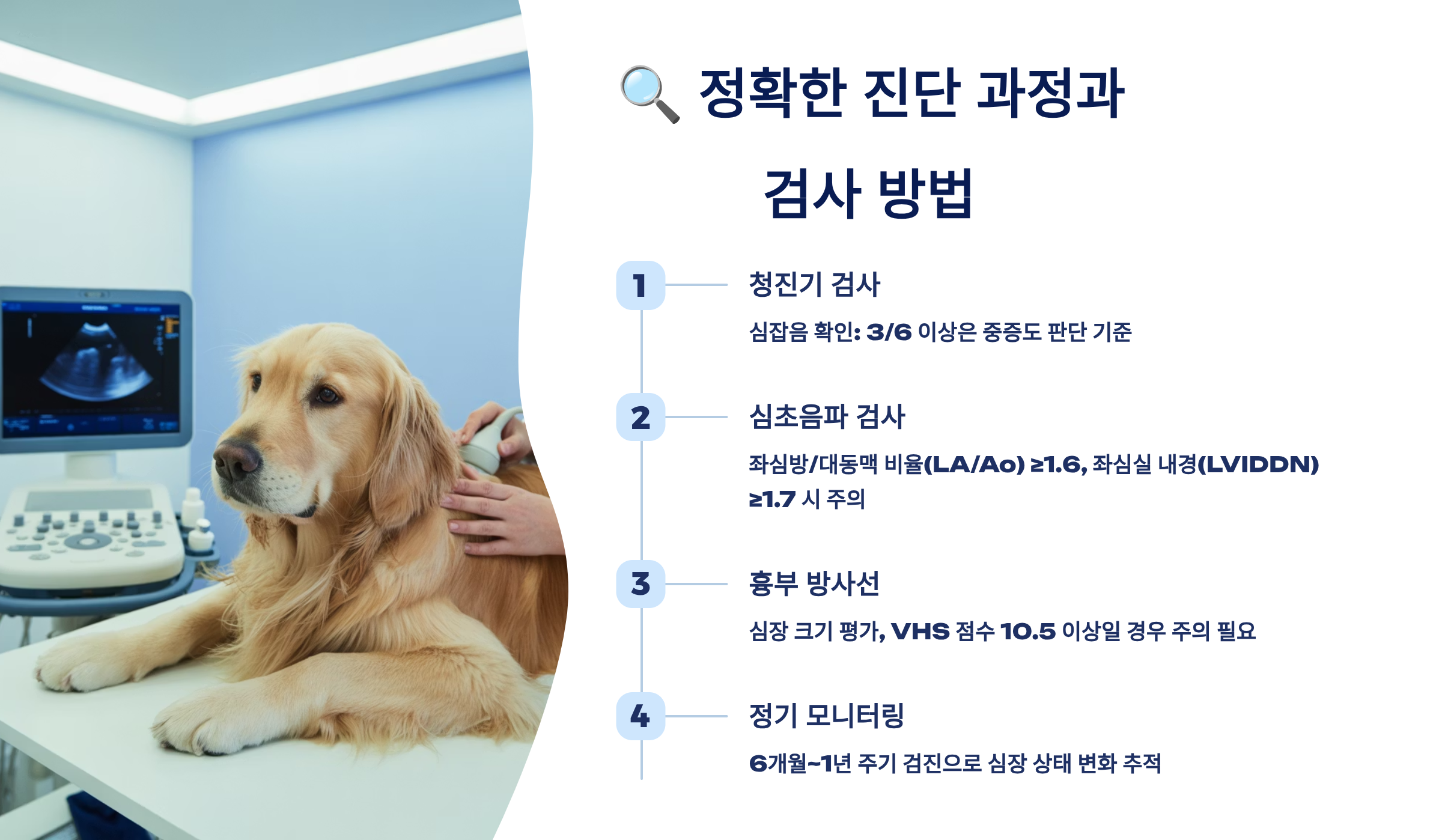 심장병의 정확한 진단은 적절한 치료의 첫걸음이에요. 수의사는 먼저 청진을 통해 심장 잡음의 유무와 강도를 확인해요. 심장 잡음은 1단계부터 6단계까지 분류되는데, 3단계 이상부터는 추가 검사가 필요해요. 청진만으로는 심장병의 종류와 심각도를 정확히 알 수 없기 때문에 다양한 검사를 진행하게 됩니다.