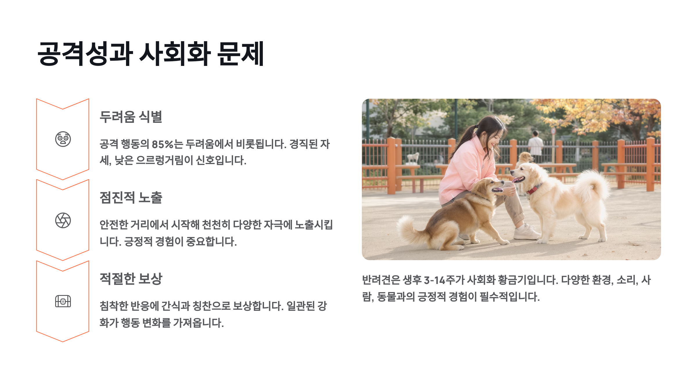 공격성 문제는 반려견 행동 교정에서 가장 신중하게 접근해야 할 영역이에요. 공격성은 다른 사람이나 동물에게 실제적인 위험을 줄 수 있기 때문에 반드시 전문가의 도움을 받는 것이 좋아요. 강아지의 공격성은 여러 형태로 나타날 수 있어요. 음식이나 장난감을 보호하려는 자원 보호 공격성, 영역을 지키려는 영역성 공격성, 두려움으로 인한 방어적 공격성, 사회화 부족으로 인한 공격성 등이 있답니다. 각각의 공격성은 서로 다른 원인과 해결 방법을 가지고 있어요.