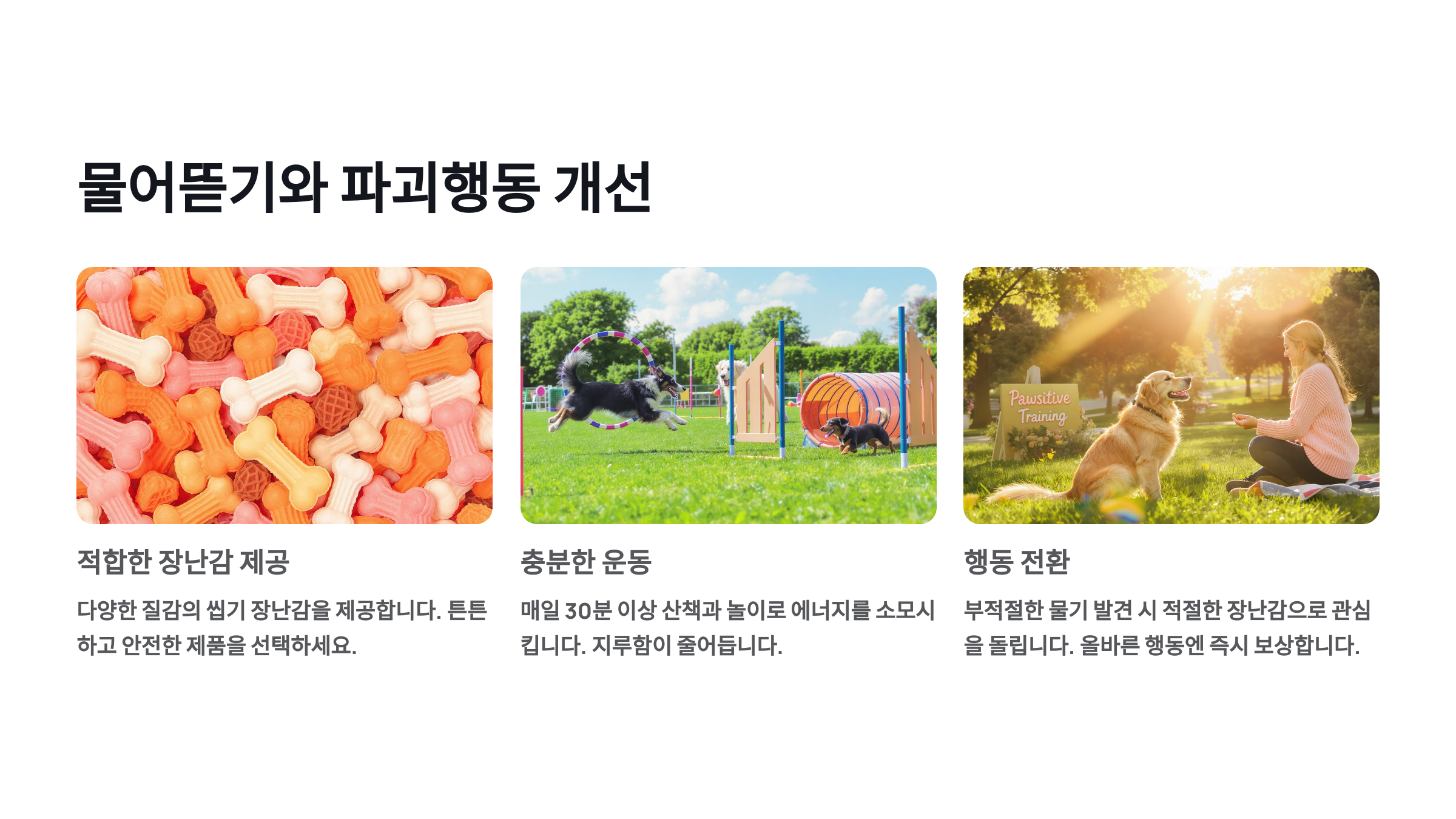 파괴행동의 원인을 정확히 파악하는 것이 첫 번째 단계예요. 어린 강아지의 경우 치아 발달 과정에서 나타나는 자연스러운 행동일 수 있어요. 생후 3-6개월 사이의 강아지들은 유치가 빠지고 영구치가 나면서 잇몸에 불편함을 느끼기 때문에 무언가를 계속 씹으려 해요. 이 시기에는 적절한 씹을거리를 제공해주는 것이 중요해요. 성견의 경우에는 에너지 발산의 수단이거나 관심을 끌기 위한 행동일 수 있어요. 특히 충분한 운동을 하지 못한 강아지들은 남은 에너지를 파괴행동으로 표출하는 경우가 많답니다.
