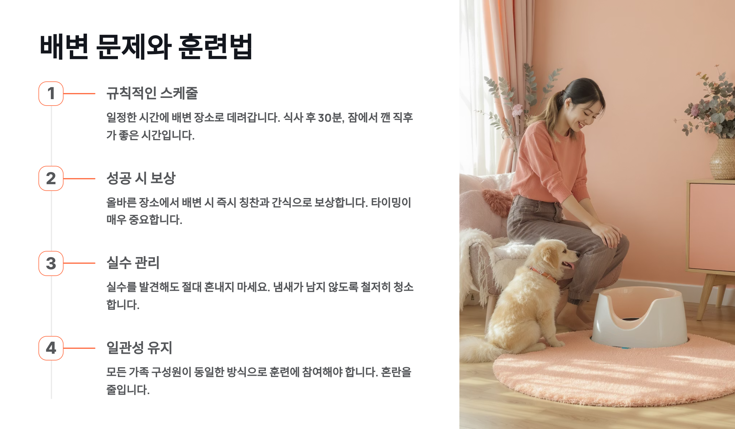 성공적인 배변 훈련의 핵심은 일정한 스케줄과 일관성이에요. 강아지는 보통 식사 후, 잠에서 깬 후, 놀이 후에 배변을 하는 경우가 많아요. 이런 타이밍을 파악해서 미리 배변 장소로 데려가 주세요. 성공적으로 배변을 했을 때는 즉시 칭찬하고 간식을 주어 긍정적인 경험으로 만들어 주세요. 배변 장소는 일정하게 유지해야 해요. 계속 장소를 바꾸면 강아지가 혼란스러워할 수 있거든요. 패드 훈련을 할 때는 처음에는 넓은 범위에 패드를 깔아두고, 강아지가 익숙해지면 점차 패드의 크기와 개수를 줄여가는 방법이 효과적이에요.