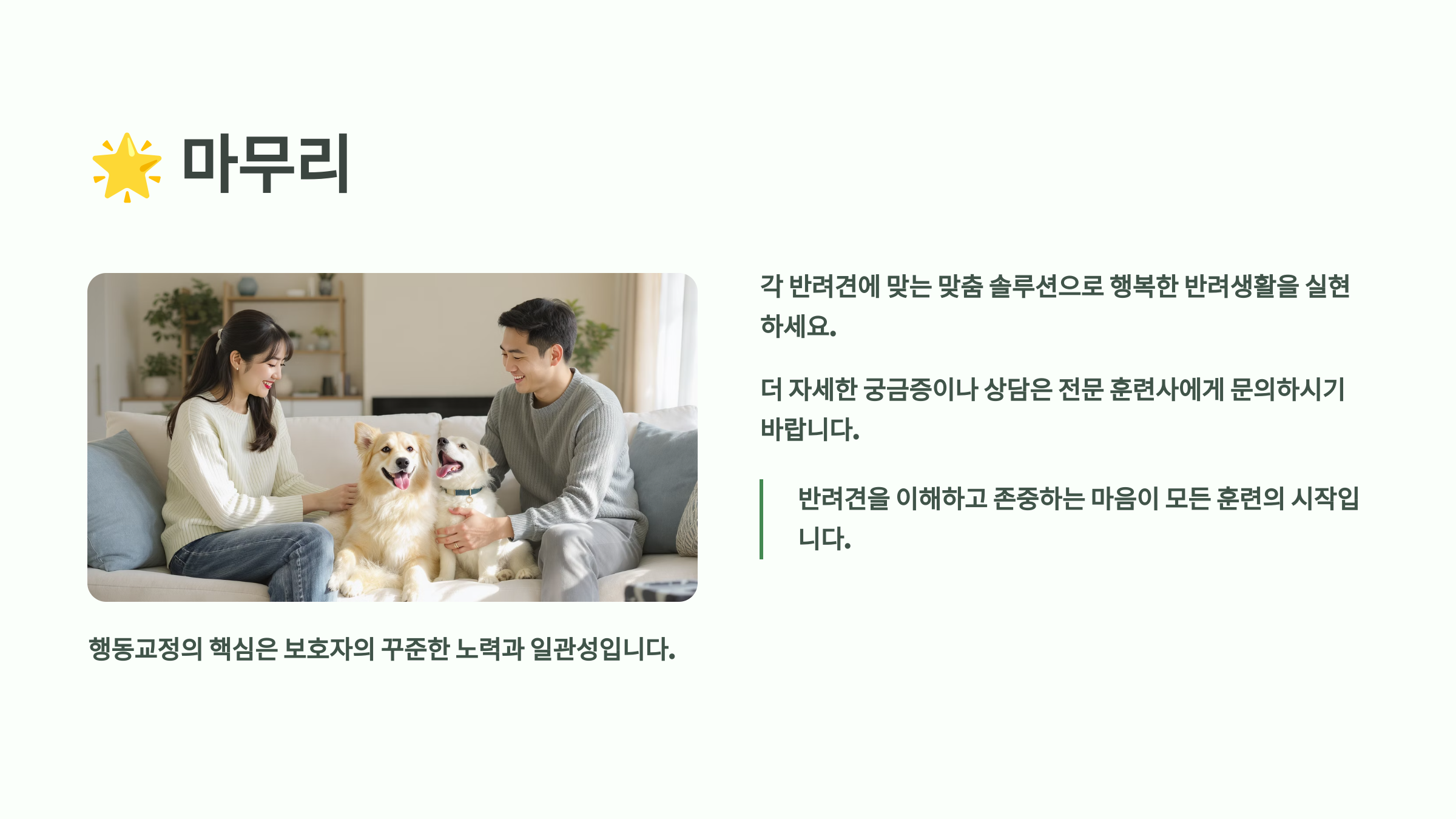 마지막으로 기억하세요. 여러분의 반려견은 이미 충분히 특별하고 사랑스러운 존재예요. 행동 교정은 그들을 바꾸는 것이 아니라, 함께 더 행복하게 살아가는 방법을 찾는 과정이랍니다. 오늘도 반려견과 함께 행복한 하루 보내세요! 🐾💖