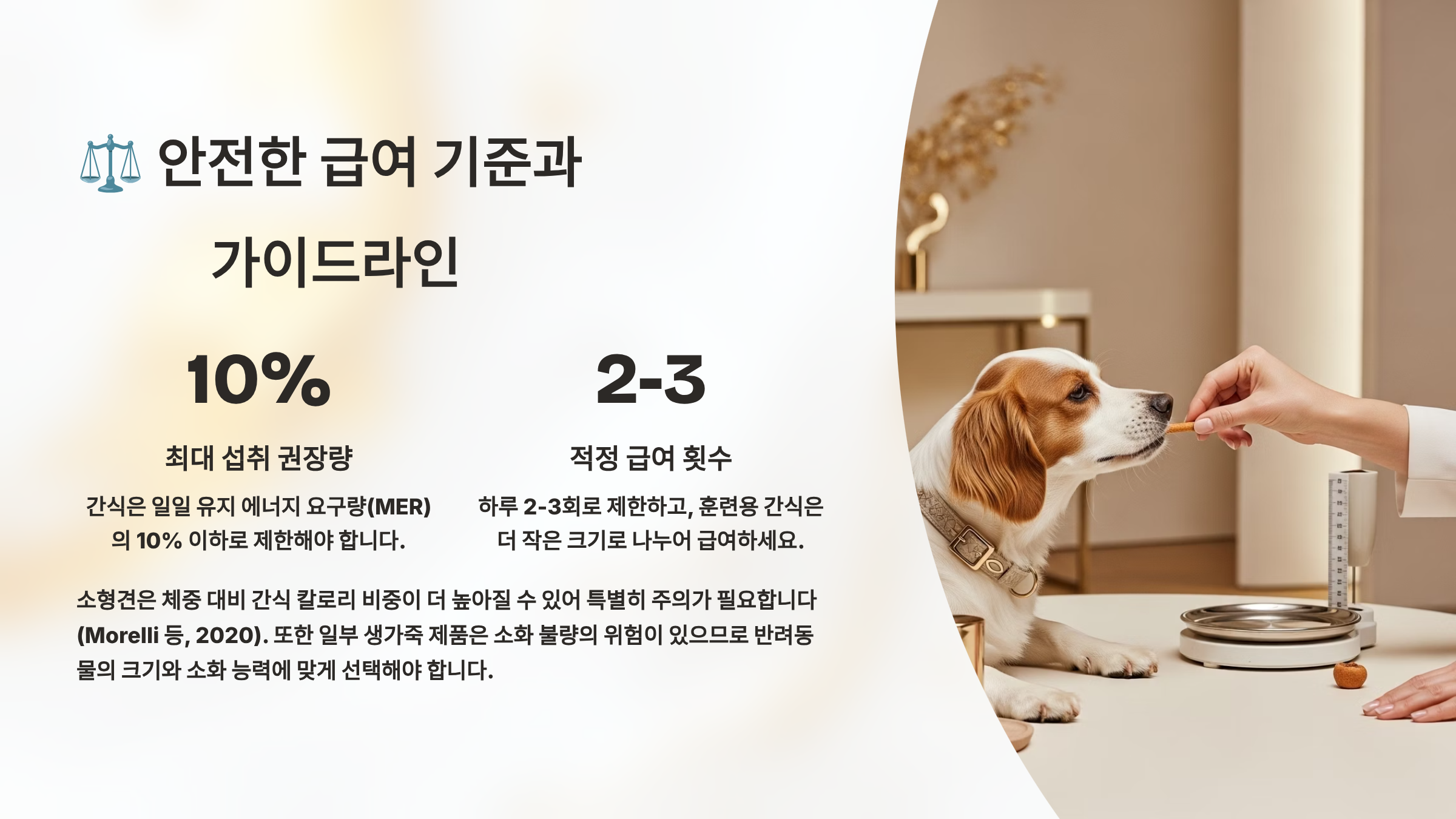 간식 급여의 황금률은 '전체 칼로리의 10% 이내'예요. ⚖️ 이 원칙은 세계 수의영양학회에서 권장하는 기준으로, 주식인 사료의 영양 균형을 해치지 않으면서도 간식의 즐거움을 줄 수 있는 적정선이랍니다. 하지만 많은 보호자분들이 이 기준을 지키기 어려워하시는데, 구체적인 계산 방법과 실천 팁을 알려드릴게요.