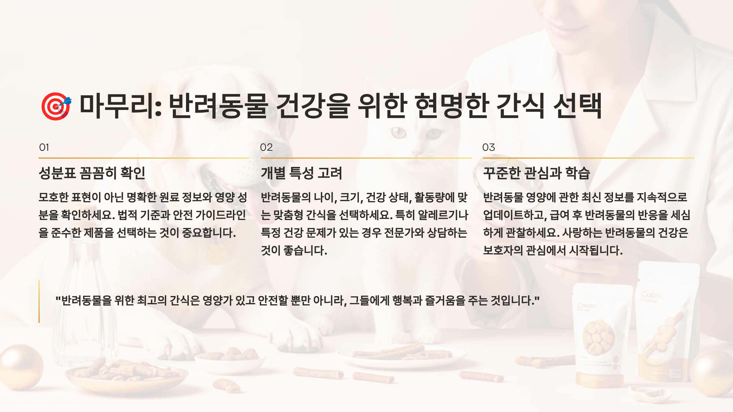 본 콘텐츠는 일반적인 반려동물 간식 정보를 제공하는 것을 목적으로 하며, 수의학적 진료나 처방을 대체할 수 없습니다. 반려동물의 건강 상태는 개체마다 다르므로, 특별한 건강 문제가 있거나 의심되는 경우 반드시 수의사와 상담하시기 바랍니다. 제시된 급여 기준과 방법은 일반적인 가이드라인이며, 개별 반려동물의 나이, 체중, 건강 상태에 따라 조정이 필요할 수 있습니다. 새로운 간식 도입 시 알레르기 반응을 주의 깊게 관찰하시고, 이상 증상 발견 시 즉시 급여를 중단하고 전문가의 도움을 받으시기 바랍니다.