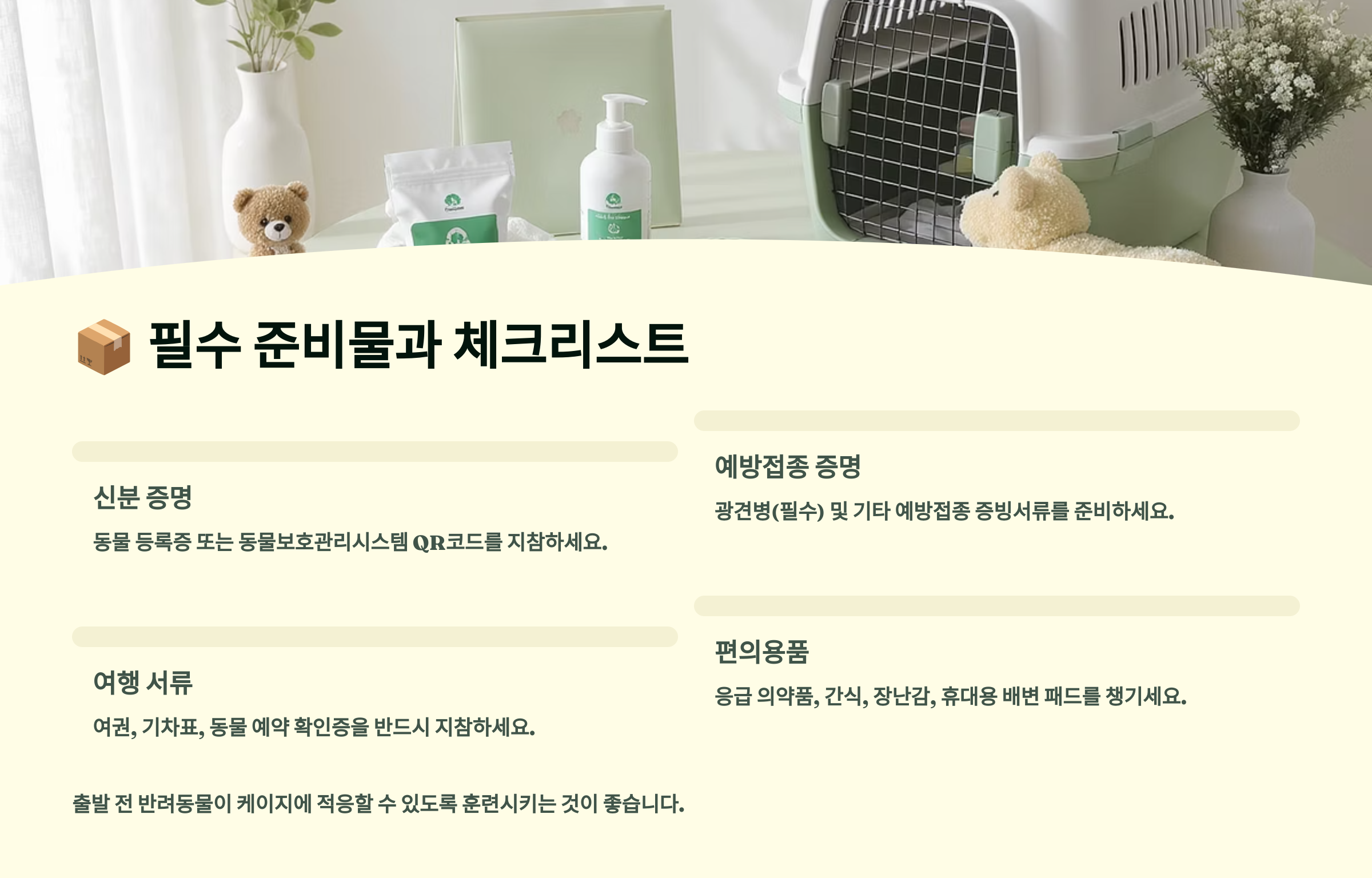 | 이동장비 | 케이지, 목줄, 가슴줄 | IATA 인증 제품 추천 |