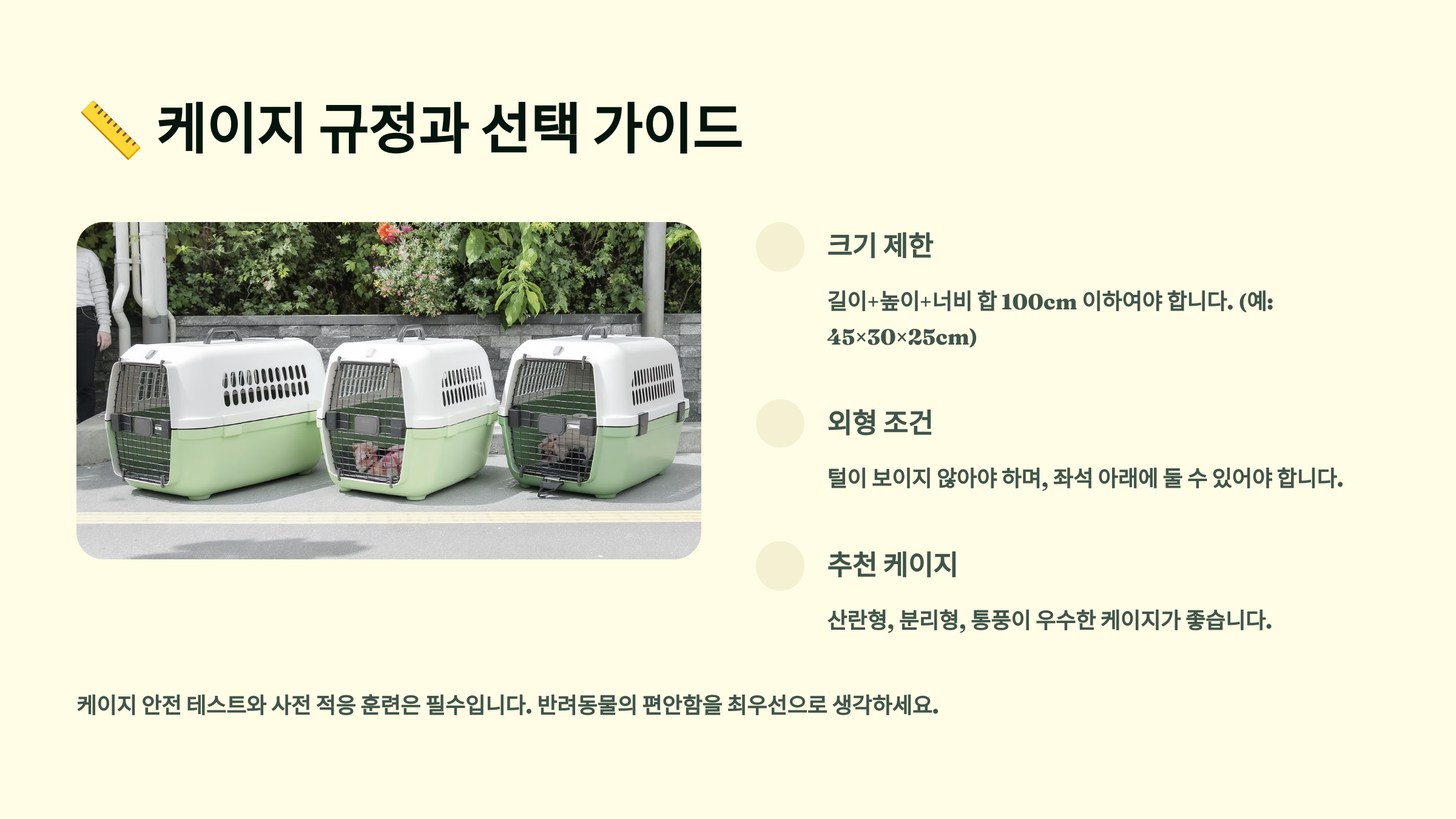 케이지 밖으로 꺼내는 것은 절대 금지예요. 아무리 얌전한 반려동물이라도 규정은 지켜야 해요. 다른 승객의 안전과 편의를 위한 규정이므로 반드시 준수해야 합니다. 예외는 응급상황뿐이에요.