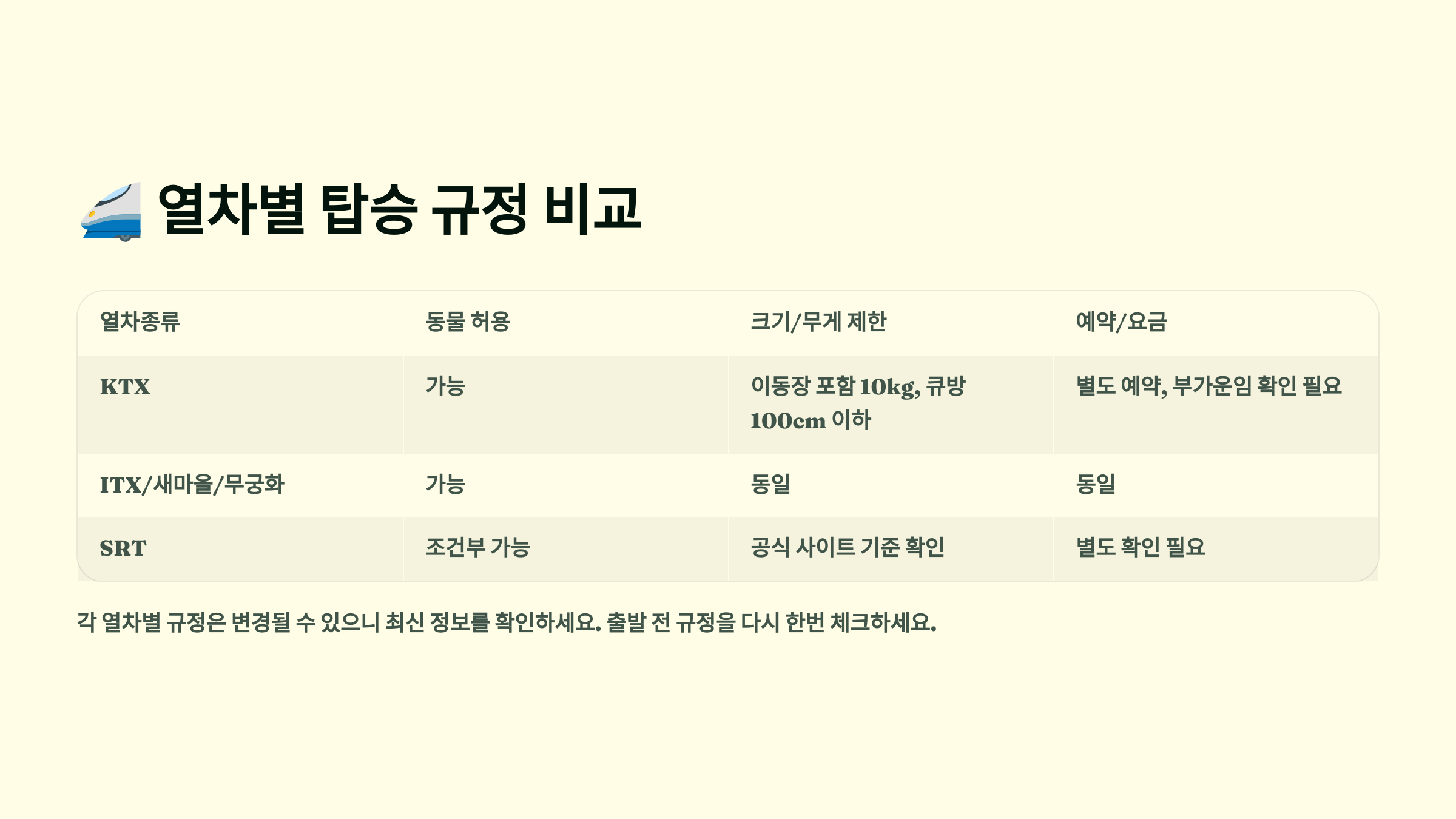 각 열차마다 반려동물 탑승 규정이 조금씩 달라요. KTX는 가장 엄격한 규정을 적용하고 있어요. 반려동물은 반드시 케이지에 넣어야 하고, 케이지는 좌석 아래나 선반에 보관해야 해요. 무릎 위에 올려놓는 것도 금지되어 있답니다.