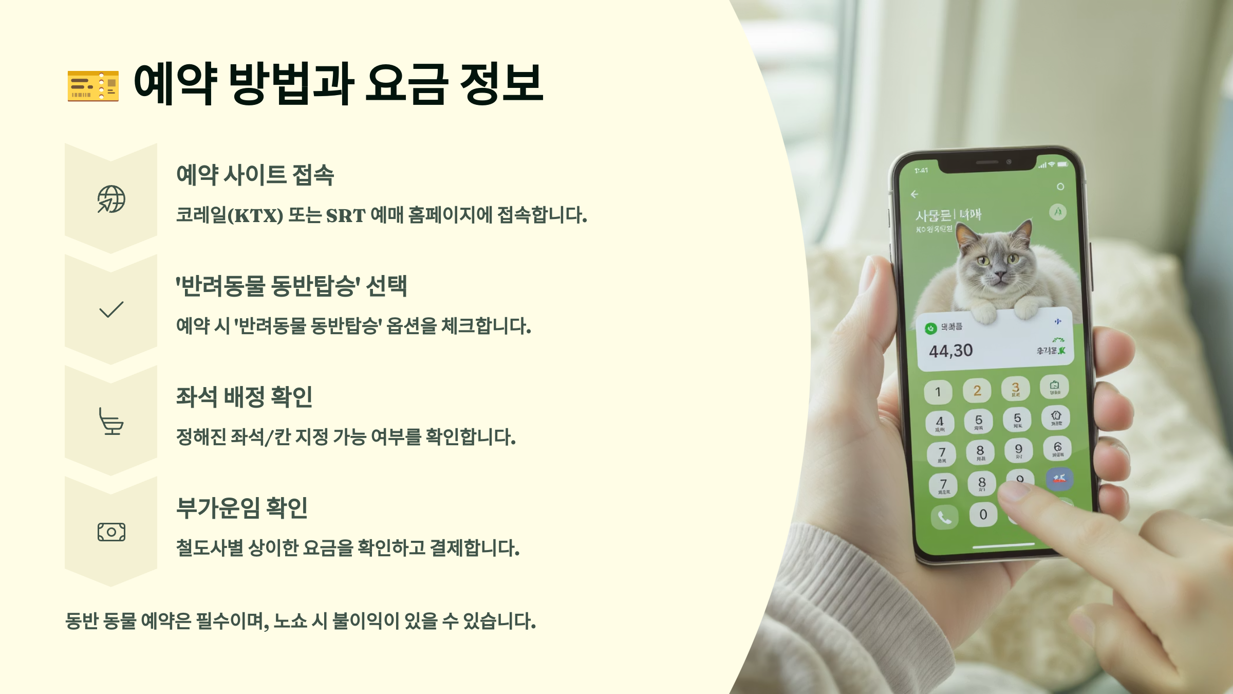 좌석 선택도 중요해요. KTX의 경우 2호차, 4호차, 6호차 등 짝수 호차의 끝 좌석이 반려동물 동반 좌석으로 지정되어 있어요. 이 좌석들은 통로 쪽에 케이지를 놓을 공간이 있어 편리하답니다.