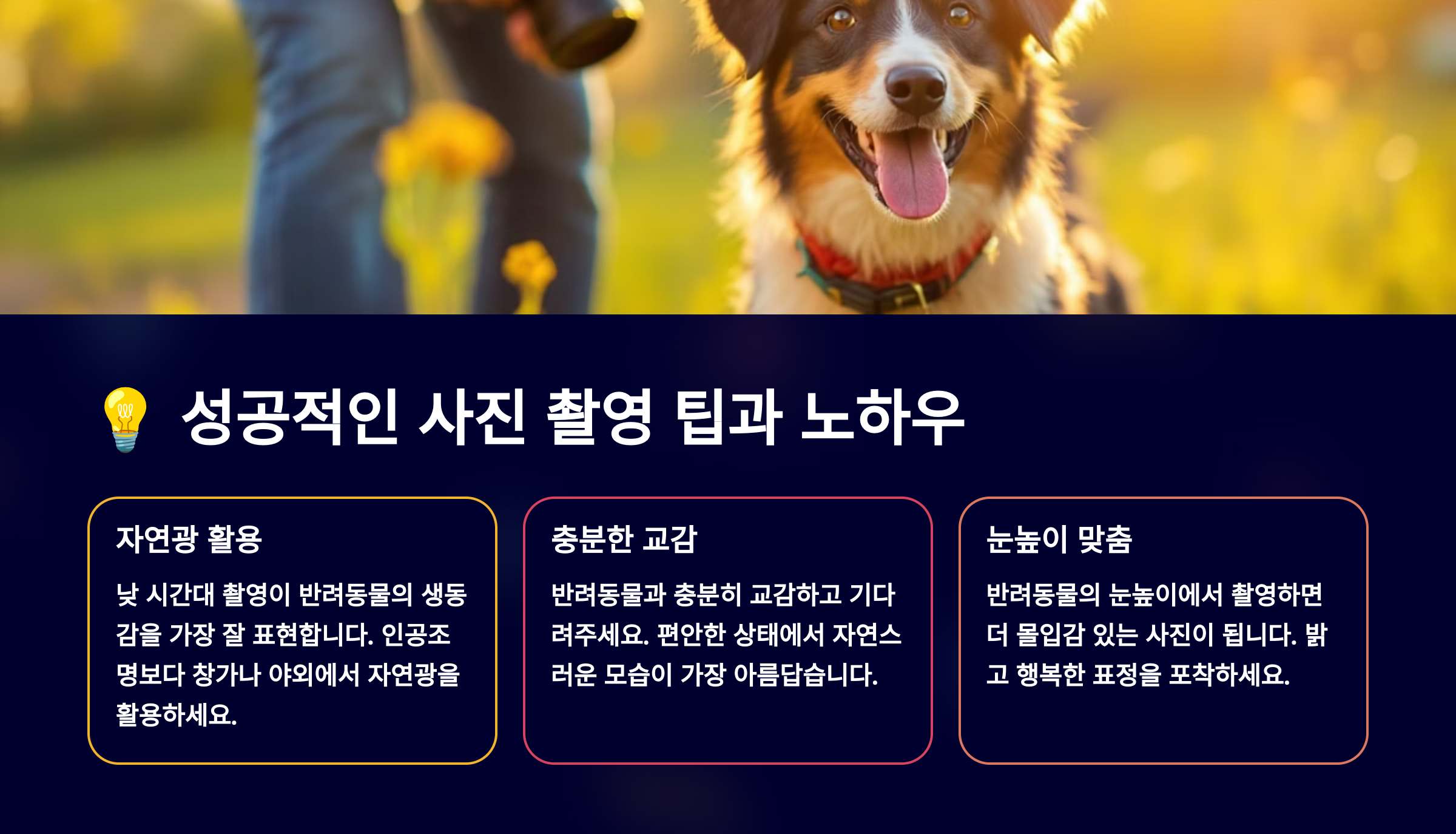 가장 중요한 건 반려동물의 안전과 행복이에요. 좋은 사진을 위해 무리하거나 스트레스를 주지 말고, 자연스럽고 즐거운 분위기에서 촬영하세요. 진정성 있는 사진이 기술적으로 완벽한 사진보다 더 많은 사람들의 마음을 움직일 수 있어요. 2025년에는 더 많은 기회가 있을 것 같으니 지금부터 차근차근 준비해서 멋진 도전을 해보세요! 🐾✨