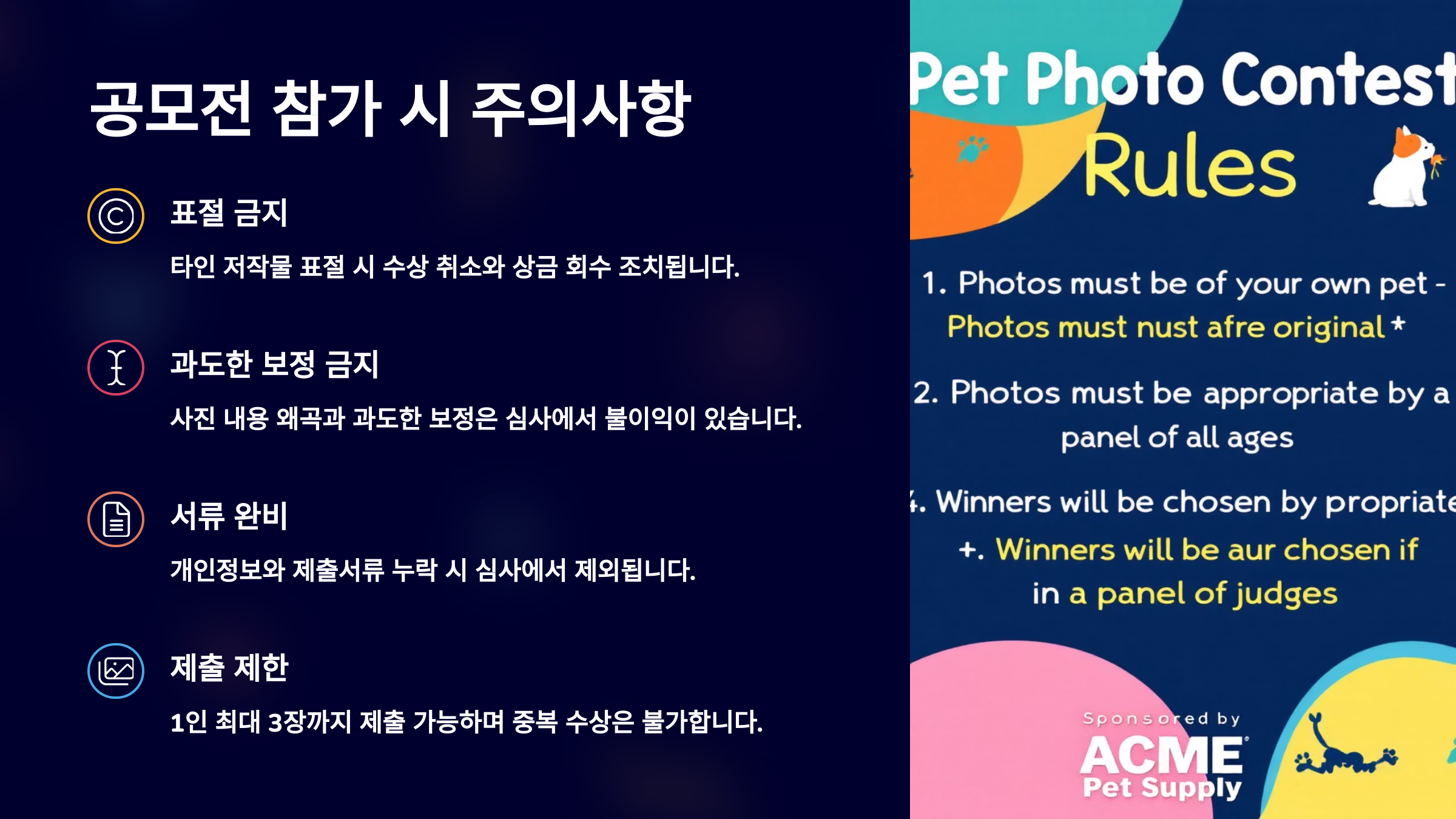 두 번째 주의사항은 저작권과 초상권 문제예요. 다른 사람의 사진을 무단으로 사용하거나 표절하면 큰 문제가 될 수 있어요. 또한 다른 사람의 반려동물을 찍어서 출품하는 것도 문제가 될 수 있으니 반드시 본인의 반려동물 사진만 출품해야 해요. 야외에서 촬영할 때 배경에 다른 사람이나 반려동물이 나오는 경우도 주의해야 해요. 가능하면 허락을 구하거나 편집으로 제거하는 것이 좋답니다. 또한 브랜드 로고나 상표가 선명하게 보이는 것도 문제가 될 수 있으니 체크해보세요.