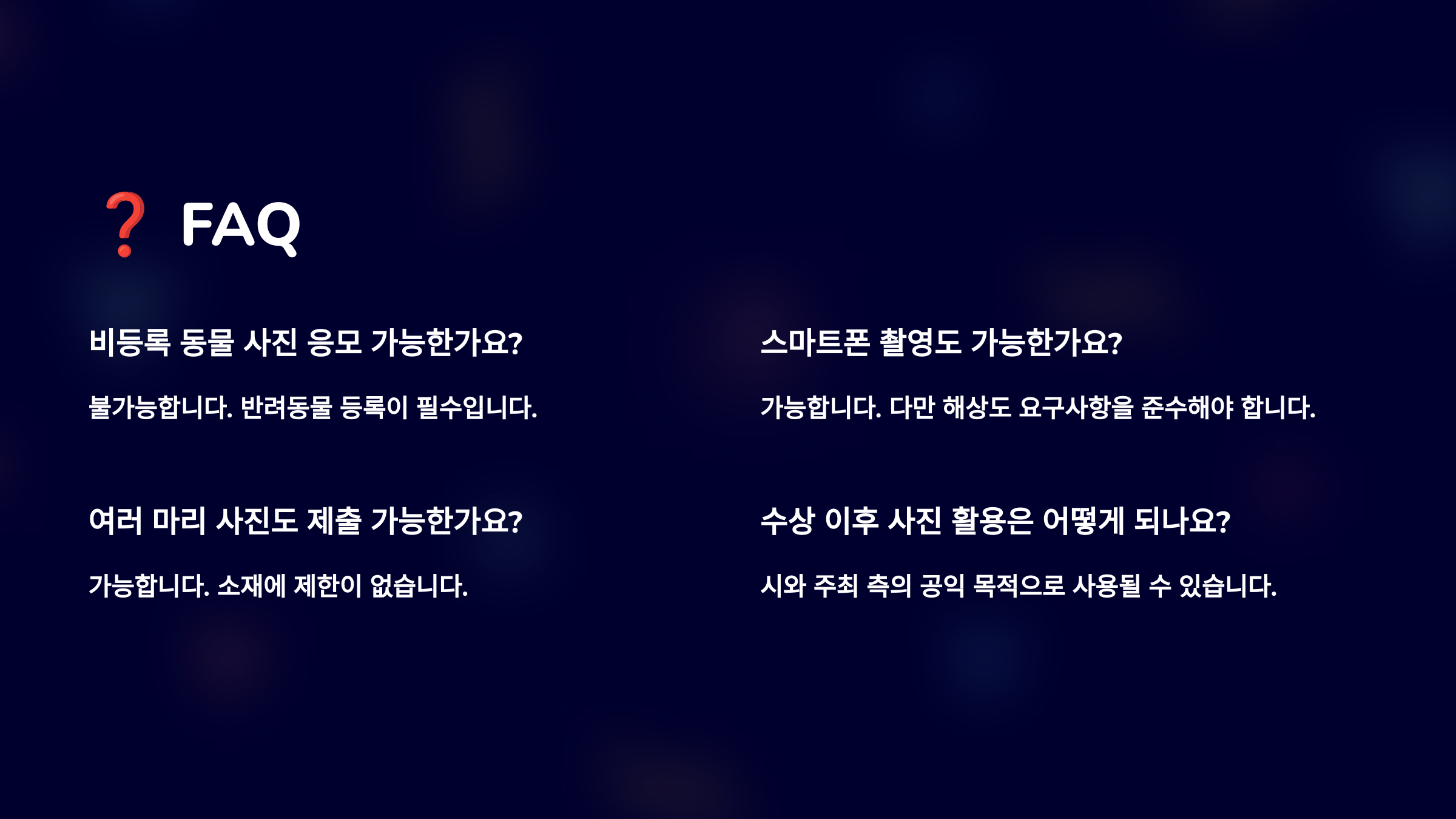 | 최우수상 | 100-200만원 | 고급 사료, 장난감 | 펫 리조트 숙박권 |