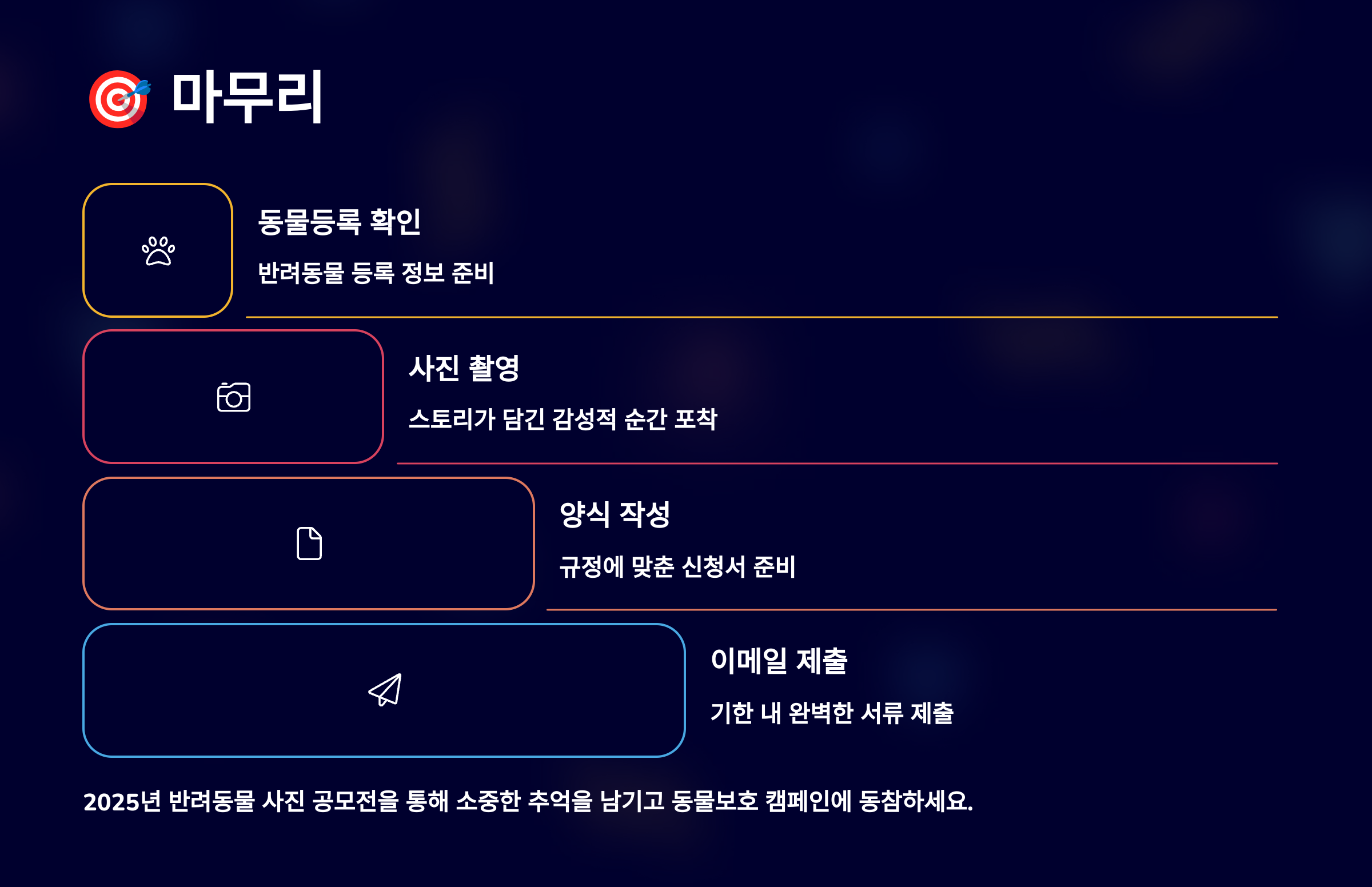 2025년에는 특히 많은 기업과 단체에서 반려동물 관련 공모전을 개최할 예정이에요. 대형 펫샵 체인부터 사료 회사, 심지어 지자체에서도 반려동물 문화 확산을 위해 다양한 공모전을 준비하고 있답니다. 참가 자격도 대부분 까다롭지 않아서 반려동물을 키우는 사람이라면 누구나 참여할 수 있어요. 이 글에서는 올해 열리는 주요 공모전 정보와 함께 수상 확률을 높이는 실전 노하우까지 모두 공유해드릴게요.