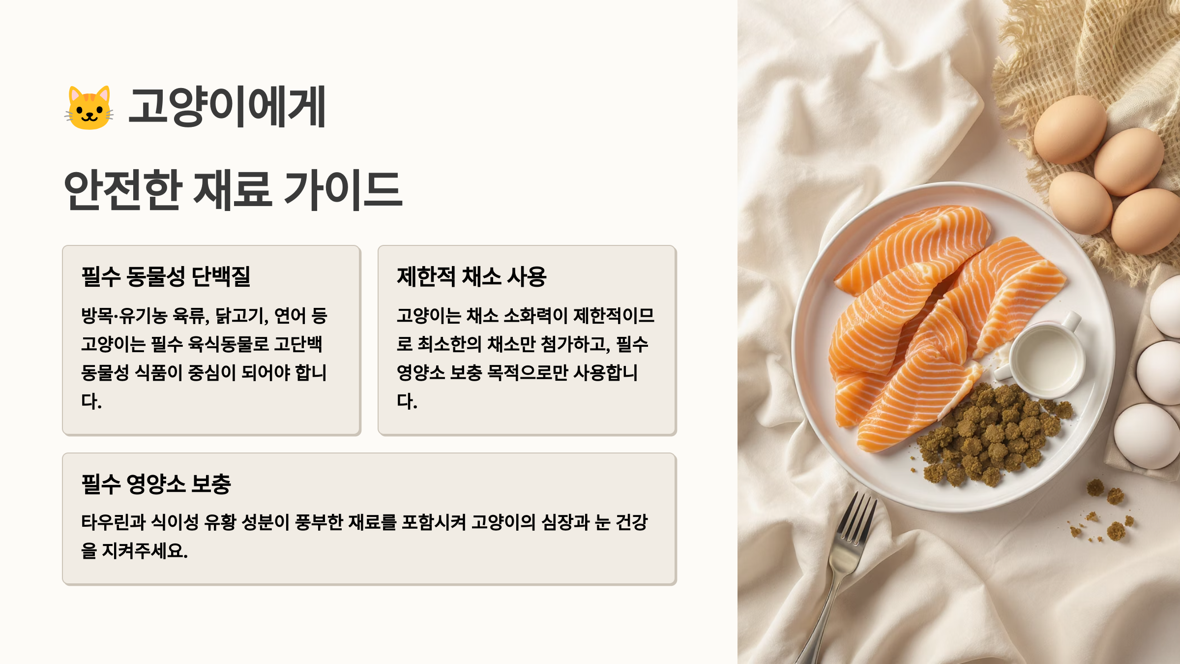 고양이는 완전한 육식동물이기 때문에 강아지와는 다른 영양 요구사항을 가지고 있어요. 고양이에게 가장 중요한 영양소는 타우린이에요. 타우린은 고양이가 스스로 합성할 수 없는 필수 아미노산으로, 심장과 눈 건강에 꼭 필요해요. 닭고기, 소고기, 참치, 연어 등의 육류와 생선에 타우린이 풍부하게 들어있답니다. 특히 닭 심장이나 간 같은 내장육은 타우린 함량이 매우 높아요.