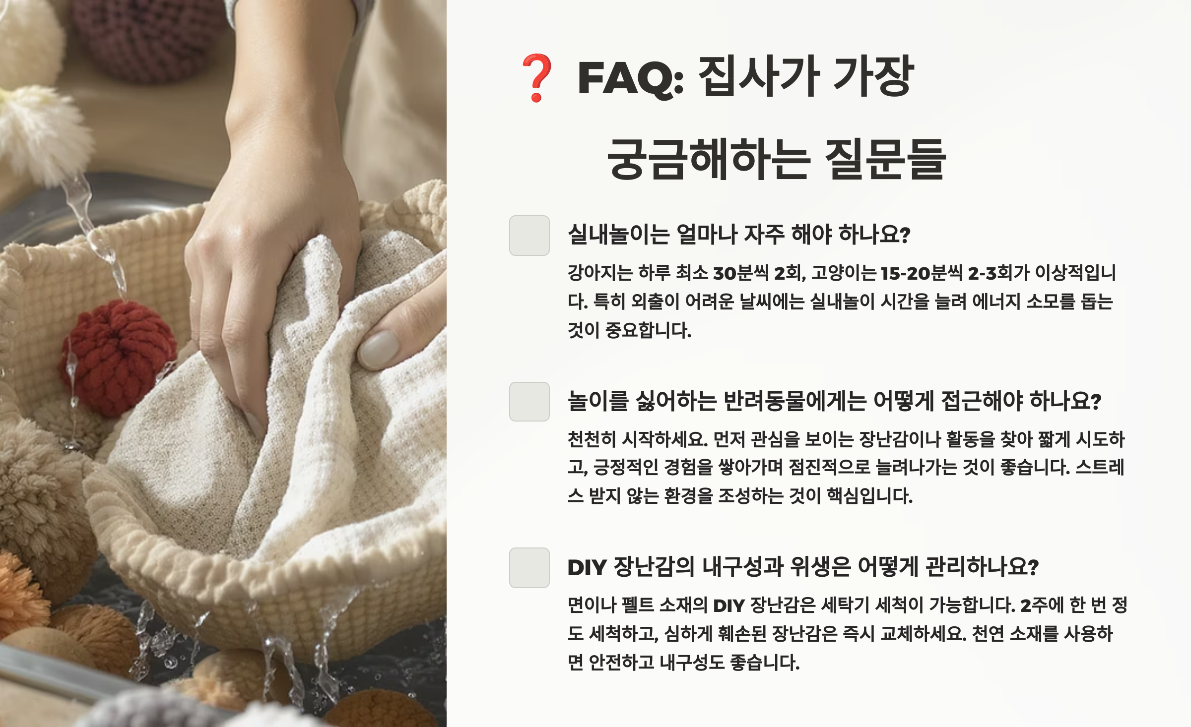 이 가이드는 일반적인 반려동물 실내놀이 정보를 제공하는 것을 목적으로 합니다. 모든 반려동물은 개체별로 성격과 건강 상태가 다르므로, 특정 놀이가 모든 동물에게 적합하지 않을 수 있습니다. 건강 문제가 있거나 특별한 관리가 필요한 반려동물의 경우 수의사와 상담 후 놀이 활동을 결정하시기 바랍니다. 놀이 중 발생할 수 있는 사고나 부상에 대해서는 보호자의 책임 하에 주의를 기울여 주시기 바랍니다.