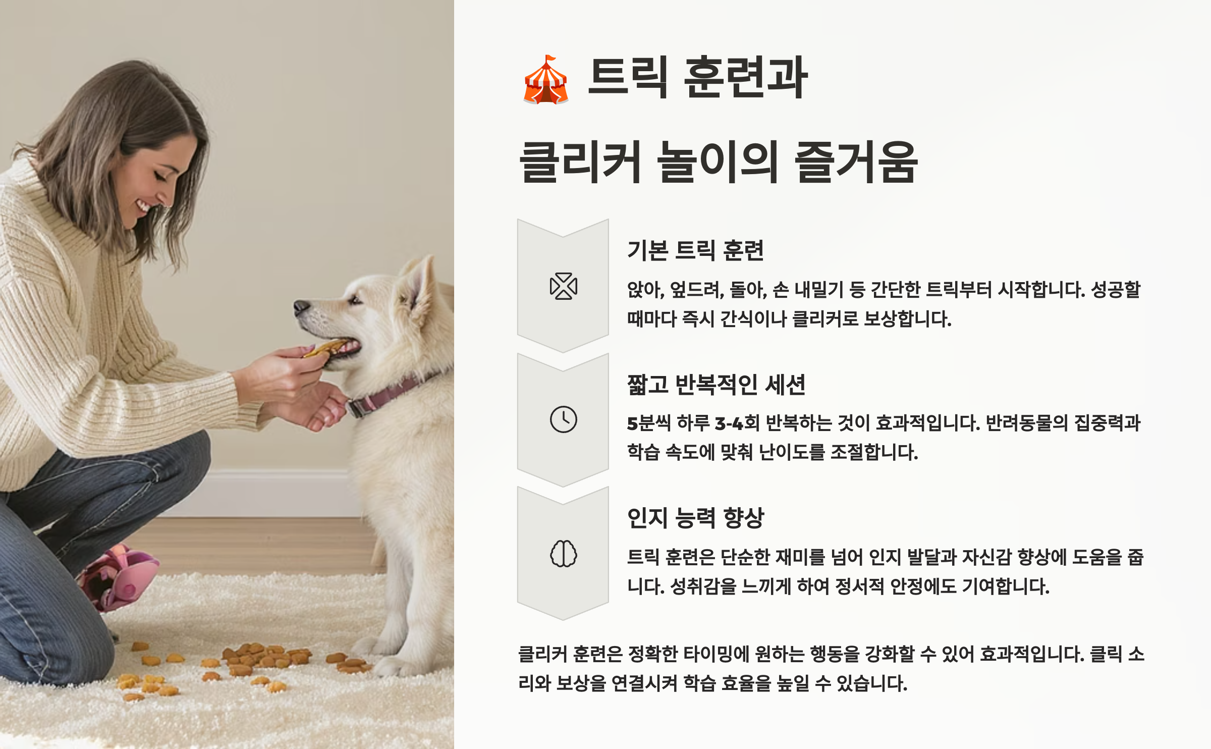 트릭 훈련은 반려동물과의 유대감을 강화하면서도 즐거운 시간을 보낼 수 있는 최고의 실내 활동이에요. 간단한 '손 주기'부터 복잡한 '죽은 척하기'까지, 다양한 트릭을 가르치는 과정에서 반려동물의 학습 능력이 향상되고 자신감도 커져요.