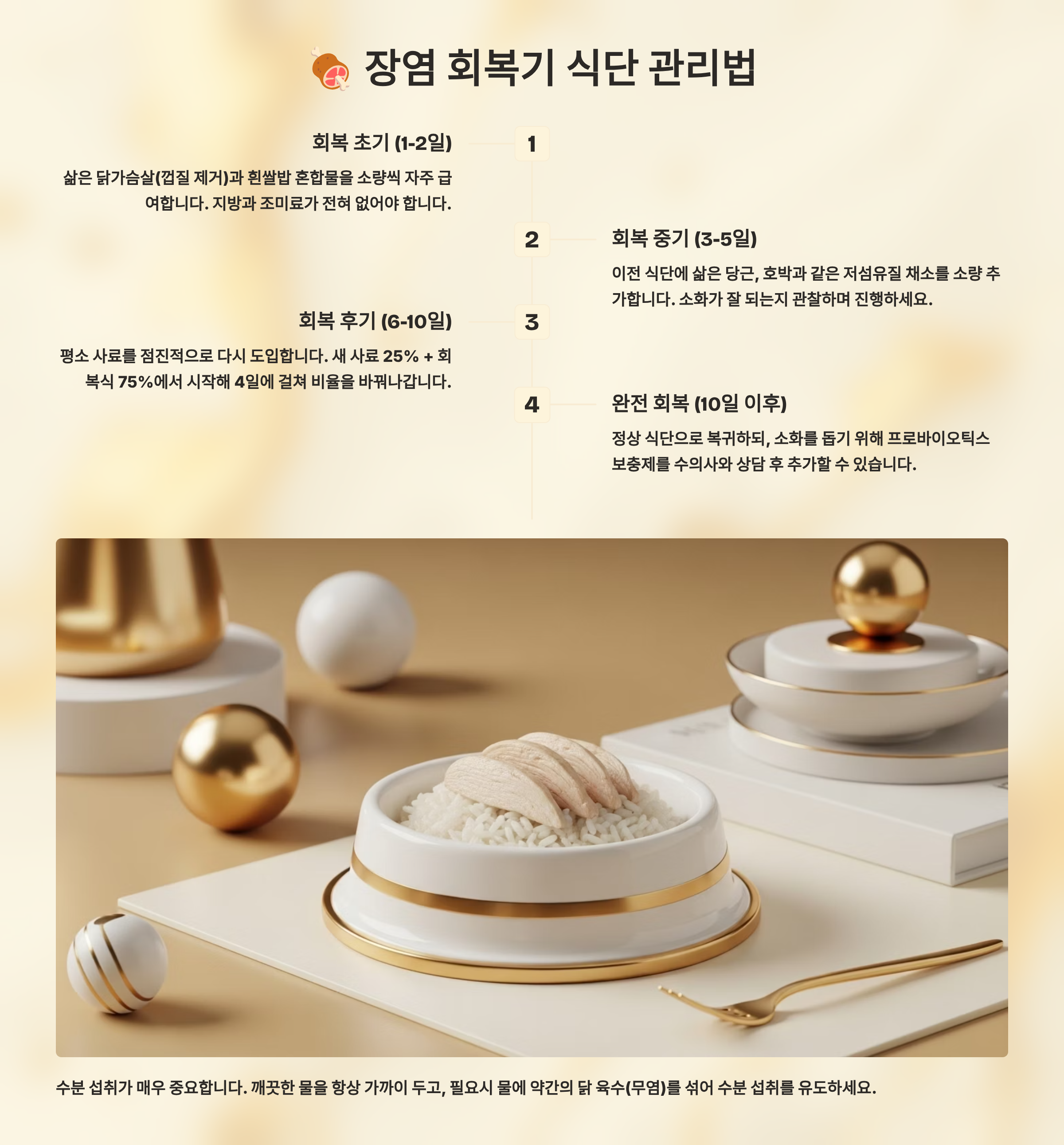 장염 회복은 단계적으로 진행돼요. 급성기(1-3일)에는 증상 조절이 최우선이에요. 구토와 설사를 멈추고 탈수를 교정하는 데 집중해야 해요. 이 시기에는 안정과 휴식이 가장 중요하며, 불필요한 자극을 최소화해야 해요.