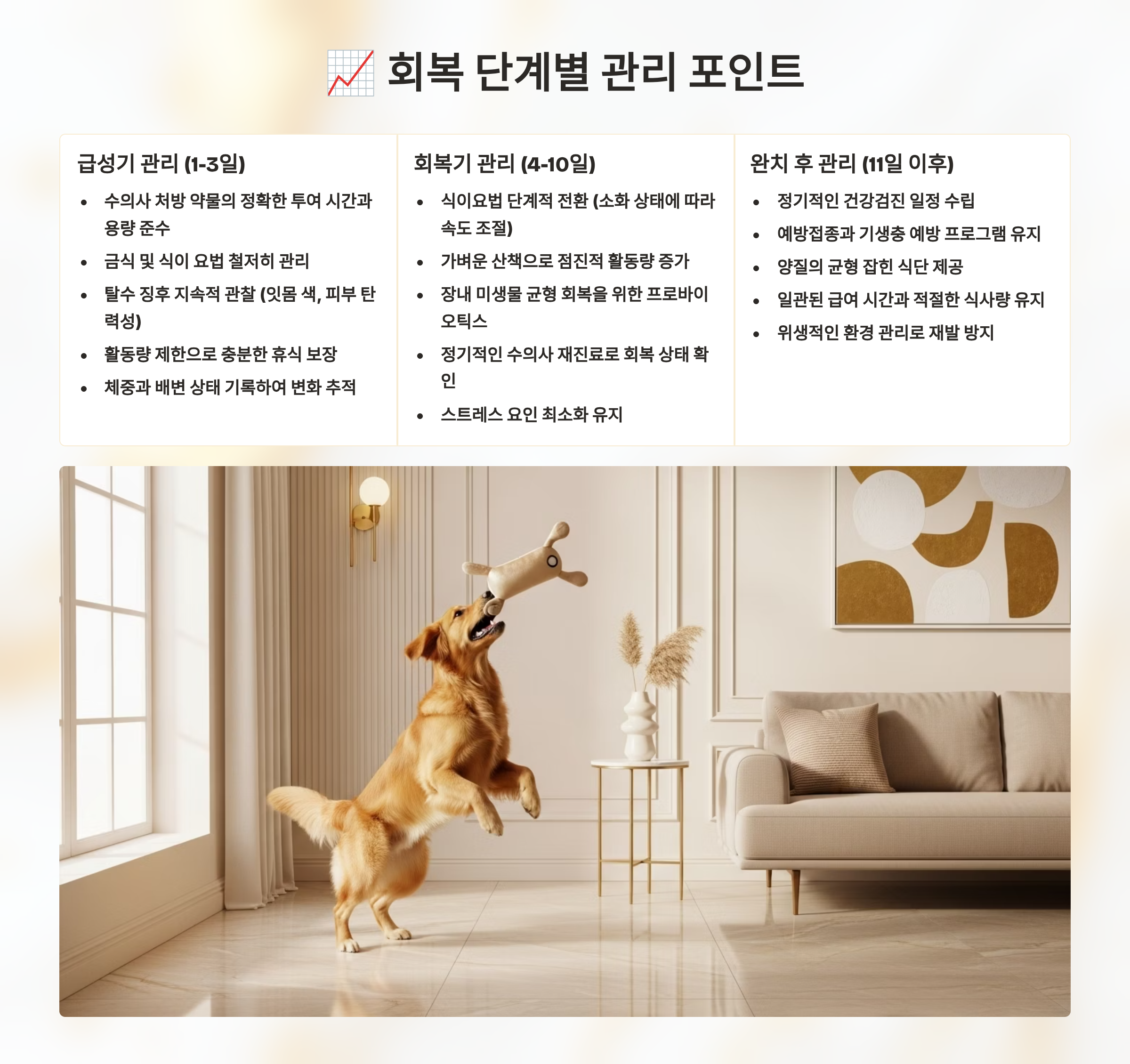 회복기에는 서서히 일상으로 돌아가야 해요. 산책은 짧게 시작해서 점차 늘려가고, 놀이나 운동은 완전히 회복될 때까지 제한하세요. 다른 동물과의 접촉도 1-2주간은 피하는 것이 좋아요. 재발 방지를 위해 스트레스 관리에 신경 써주세요. 🏡