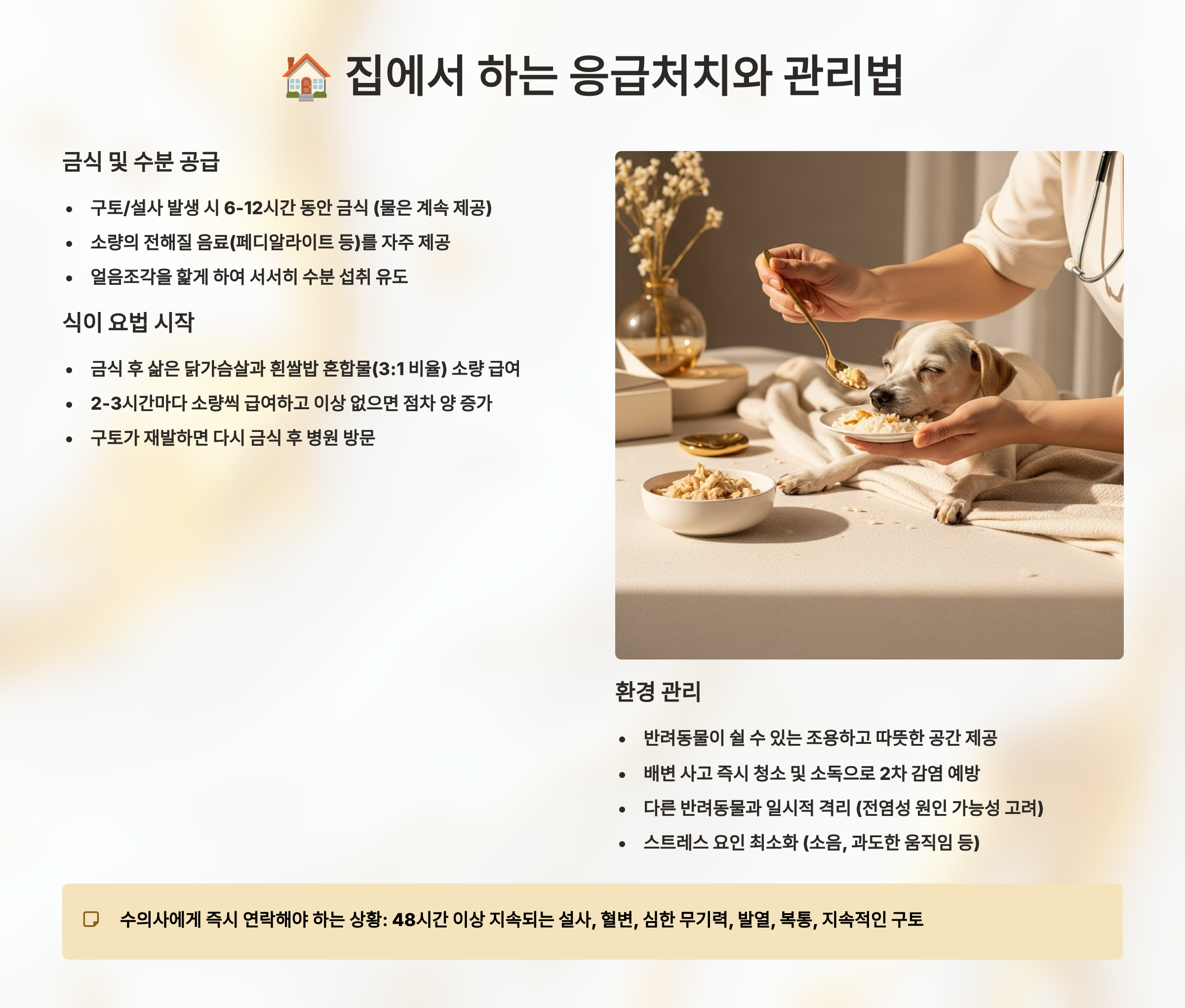 A22. 12-24시간 금식 후 소량의 물부터 시작하세요. 체온 유지, 조용한 환경 제공이 중요합니다. 하지만 증상이 악화되면 자가 치료보다 병원 방문이 우선입니다.