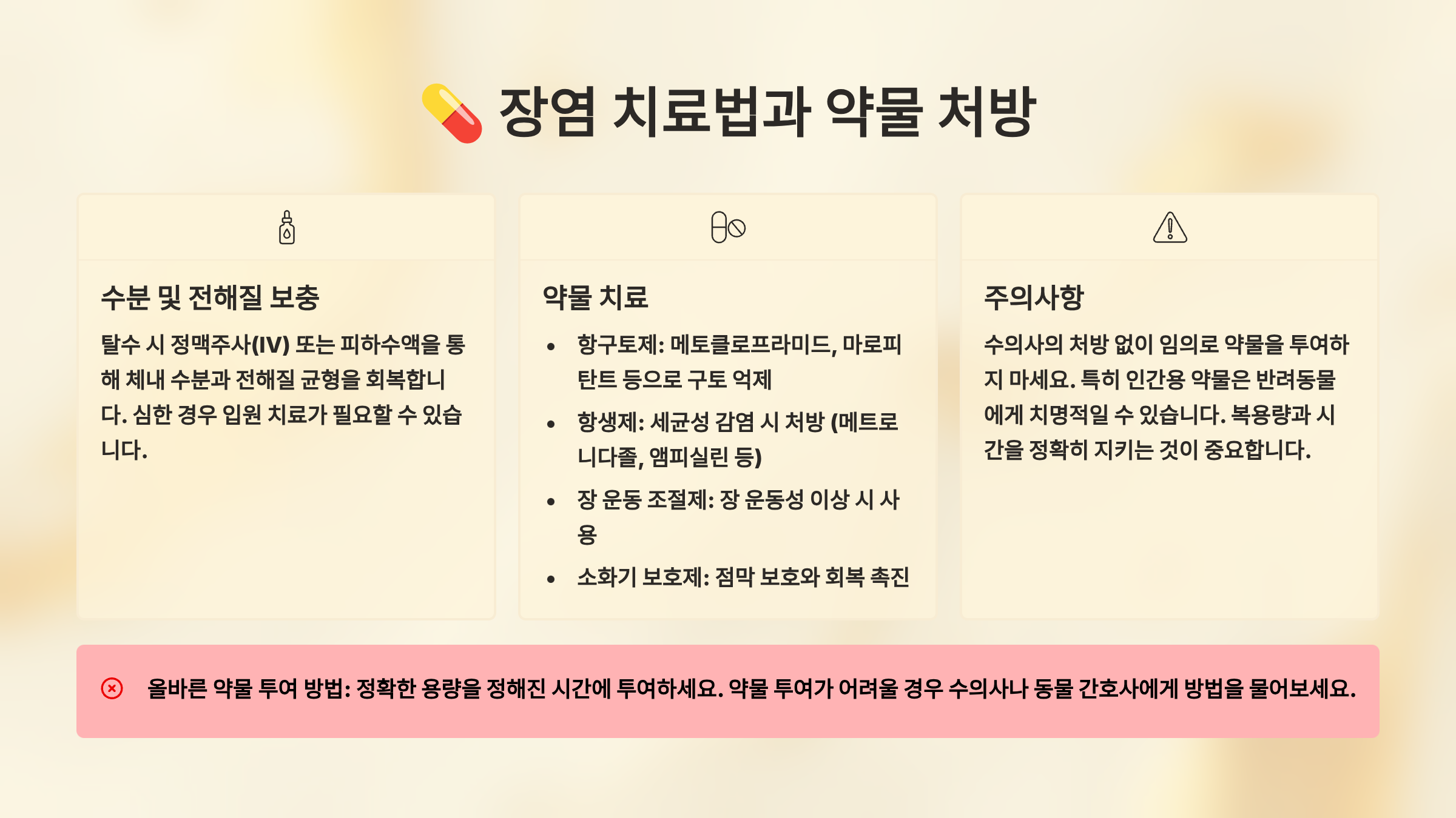 장염 치료는 보호자의 세심한 관리가 회복의 열쇠예요. 처방받은 약물을 정확히 투여하고, 식단 관리를 철저히 하며, 충분한 휴식을 제공해주세요. 매일 증상을 기록하고, 이상 징후가 있으면 즉시 수의사와 상담하는 것이 중요합니다.