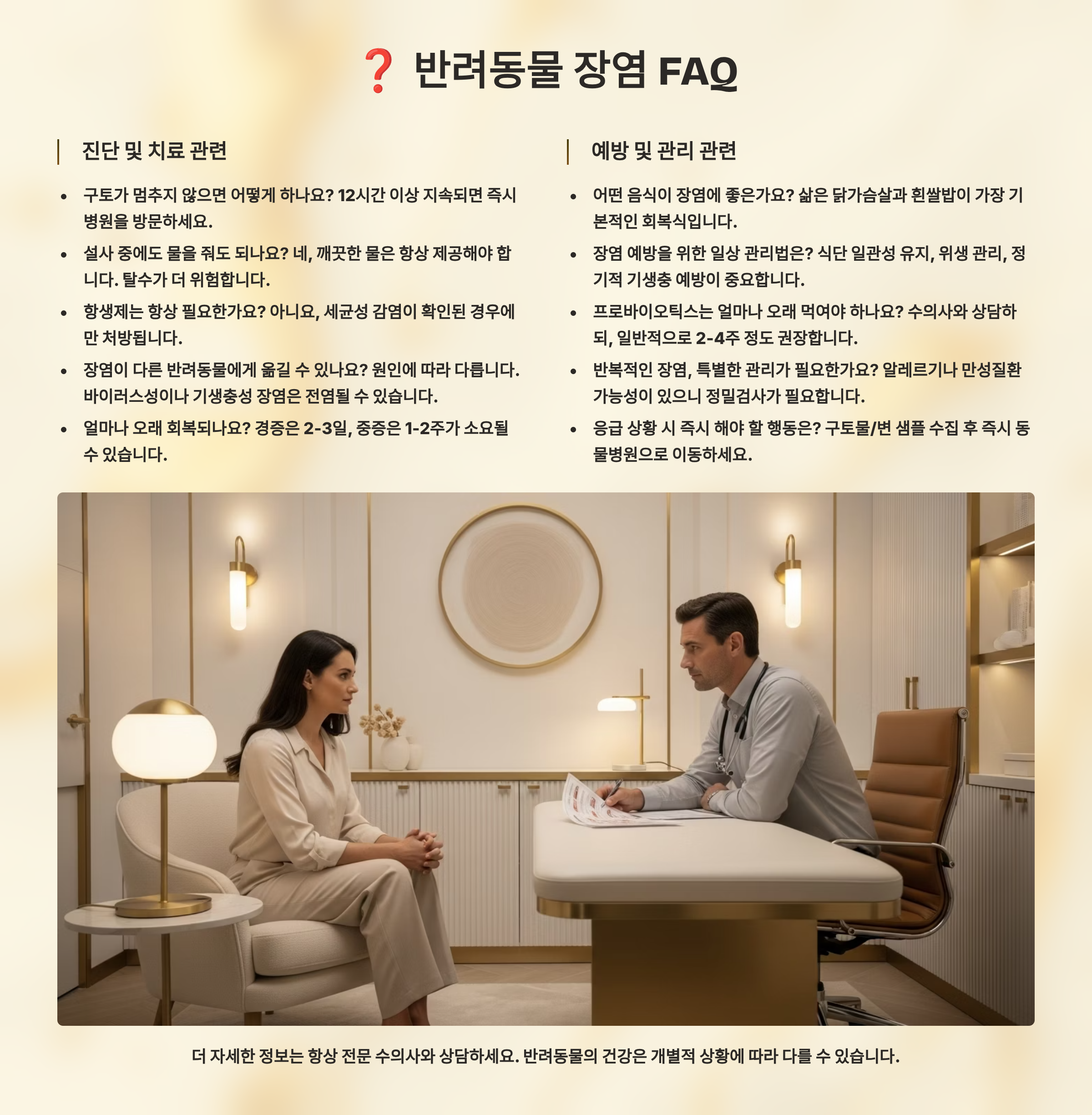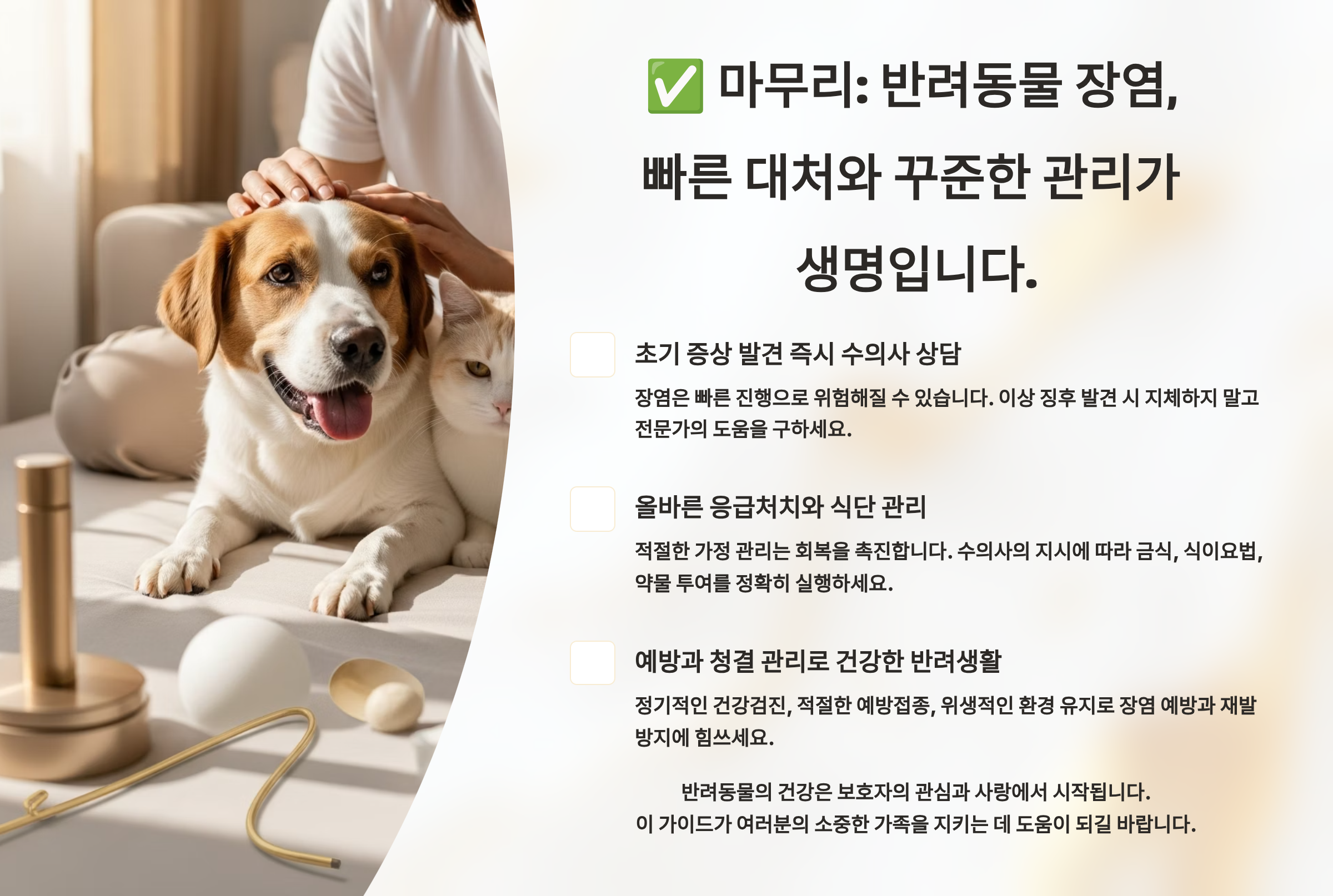 장염 치료는 보호자의 세심한 관리가 회복의 열쇠예요. 처방받은 약물을 정확히 투여하고, 식단 관리를 철저히 하며, 충분한 휴식을 제공해주세요. 매일 증상을 기록하고, 이상 징후가 있으면 즉시 수의사와 상담하는 것이 중요합니다.