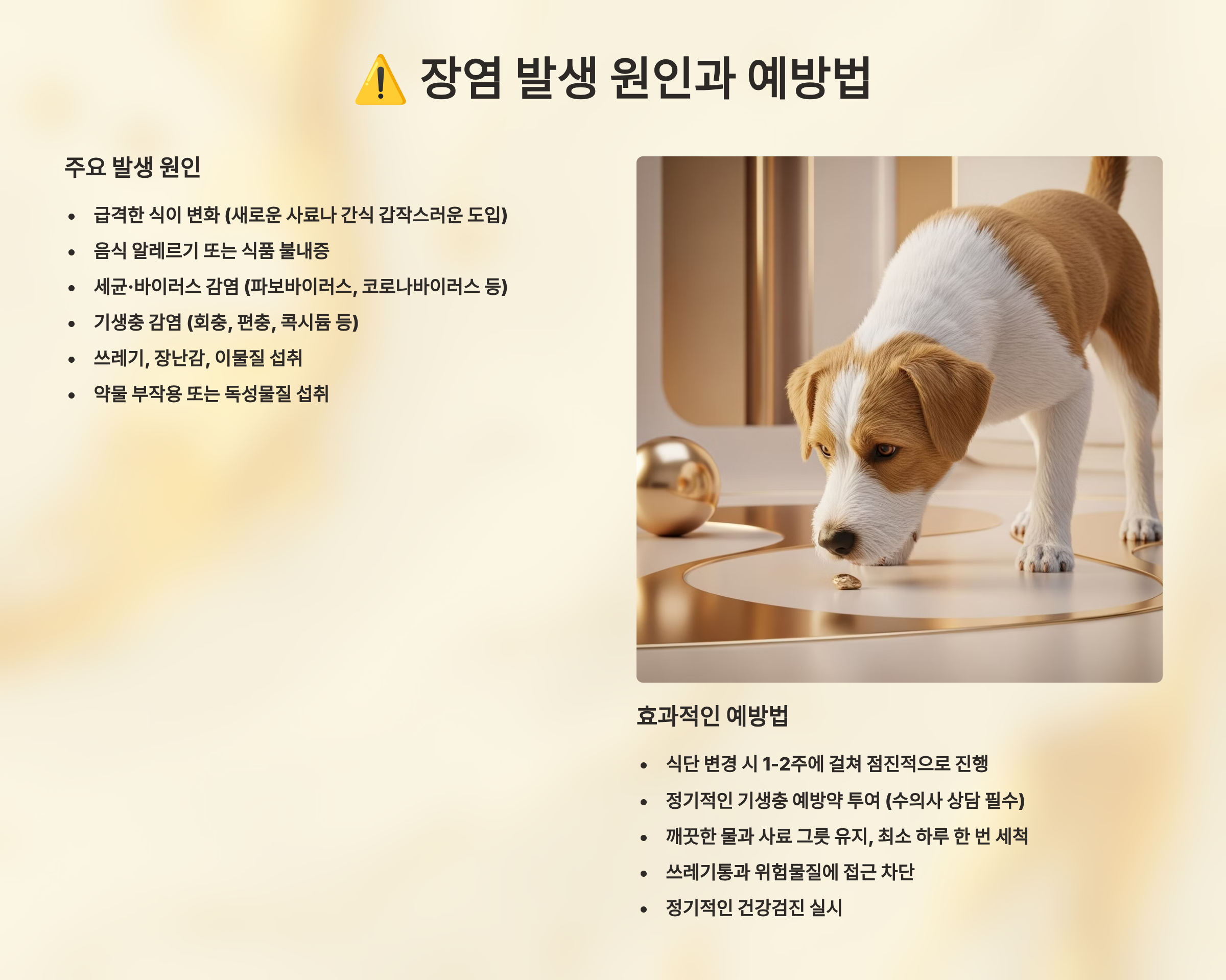 계절별로도 장염 발생 패턴이 달라요. 여름철에는 세균성 장염이, 겨울철에는 바이러스성 장염이 많이 발생해요. 장마철에는 곰팡이 독소에 의한 장염도 주의해야 해요. 사료 보관 상태를 철저히 관리하고, 급여 전 이상 유무를 확인하는 습관이 중요해요. 🐾