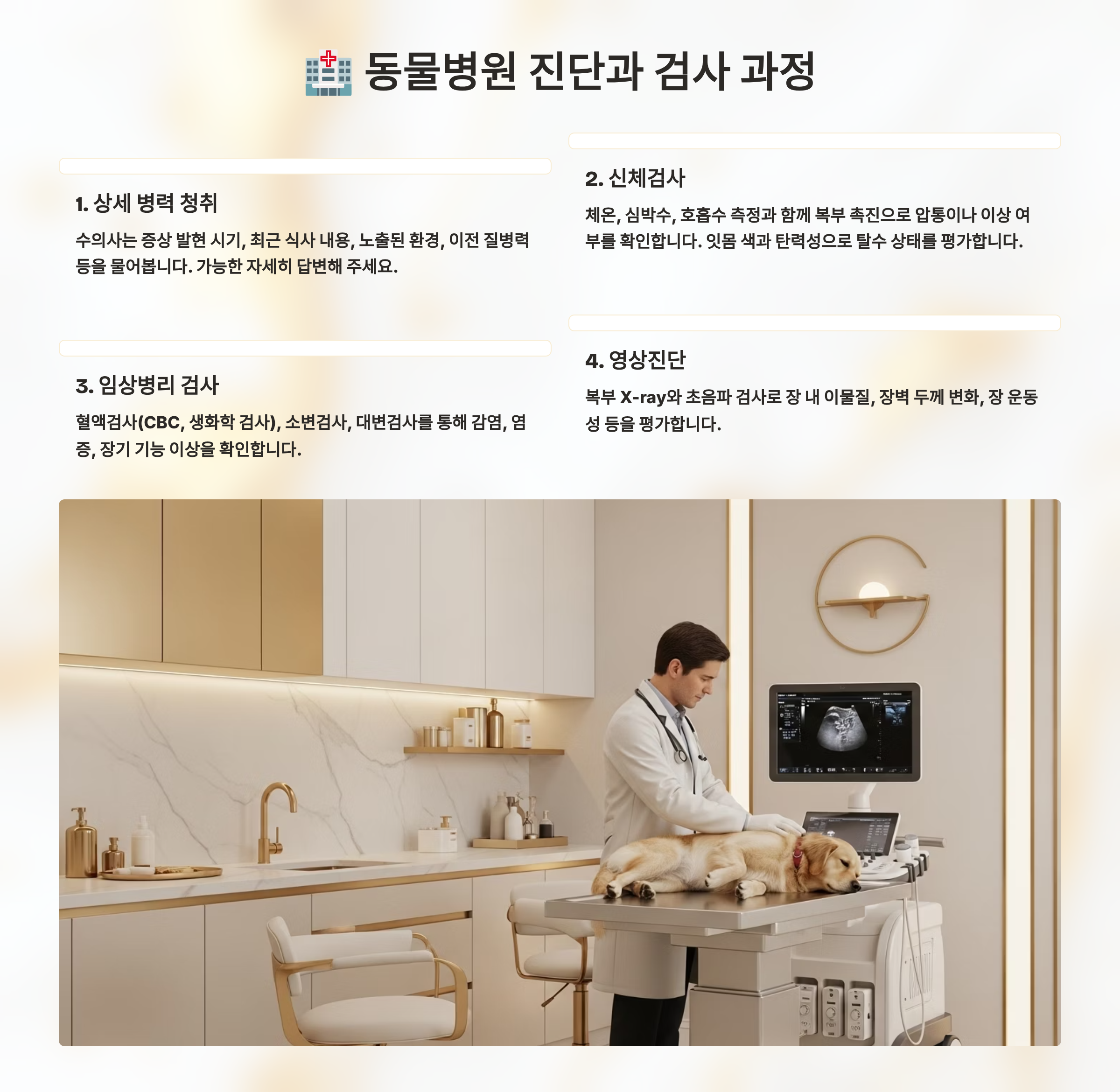동물병원에서는 먼저 상세한 문진을 통해 증상 발생 시기와 경과를 파악해요. 최근 먹은 음식, 구토물이나 설사의 양상, 예방접종 이력, 구충 시기 등을 확인해요. 보호자가 촬영한 사진이나 동영상이 있다면 진단에 큰 도움이 돼요.