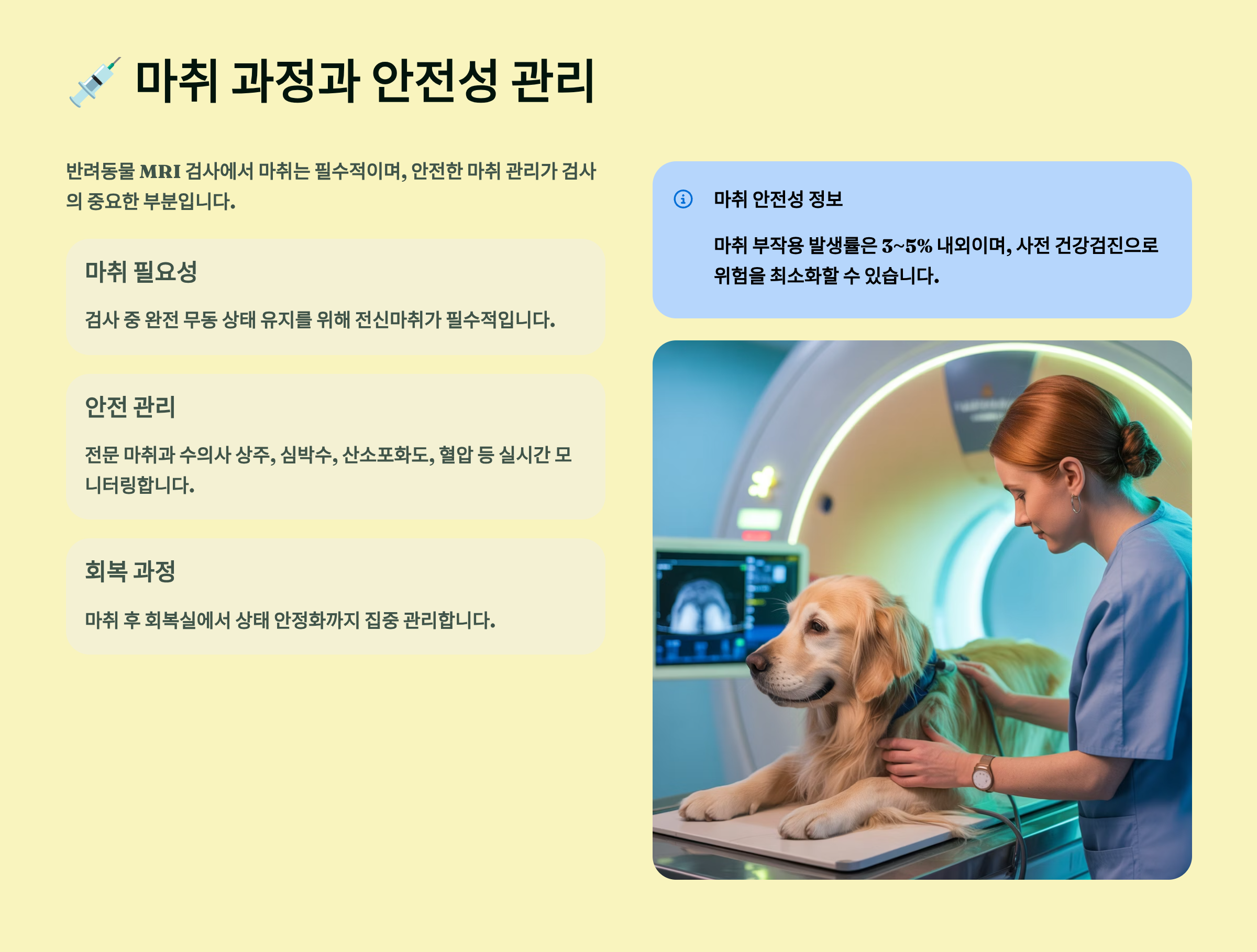 반려동물 MRI 검사에서 마취는 필수적이에요. 사람과 달리 동물은 검사 중 가만히 있을 수 없기 때문이죠. MRI는 아주 작은 움직임도 영상 품질에 영향을 주기 때문에 완전한 부동 상태를 유지해야 해요. 전신마취는 이를 가능하게 하면서도 통증이나 불안감 없이 검사를 받을 수 있게 해준답니다.