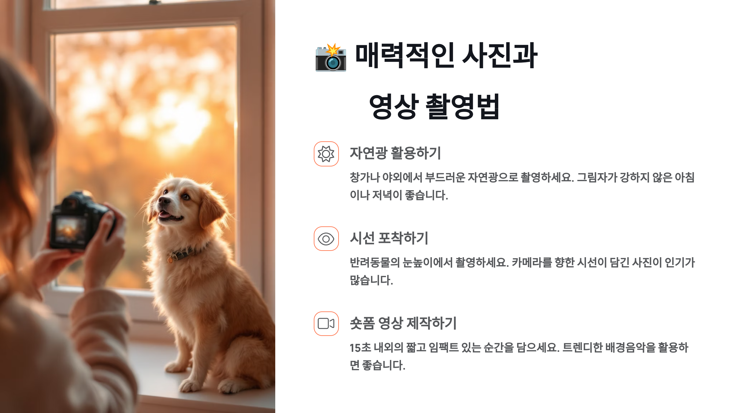 반려동물의 개성과 매력을 파악하는 것도 필수적이에요. 우리 반려동물이 어떤 특별한 행동이나 표정을 자주 보이는지, 어떤 상황에서 가장 자연스럽고 예쁜 모습을 보이는지 관찰해보세요. 어떤 아이는 장난감과 노는 모습이 특히 귀엽고, 어떤 아이는 잠자는 모습이 천사 같고, 또 어떤 아이는 산책할 때 가장 생생한 표정을 보여줘요. 이런 개성을 파악해야 일관된 콘텐츠 컨셉을 잡을 수 있어요.