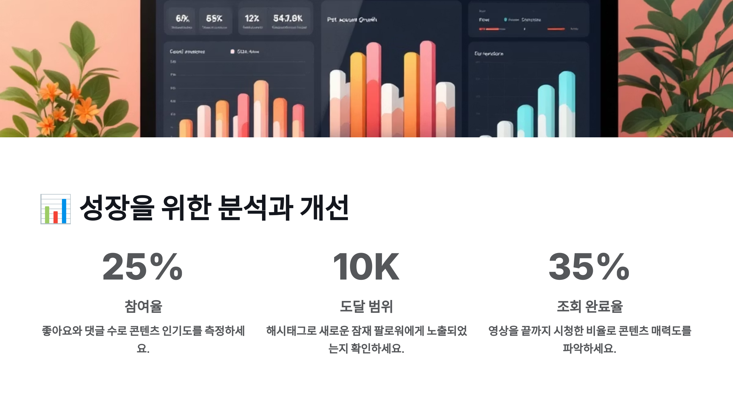 | 팔로워 수 | 주간 | 5-10% | 해시태그 최적화 |